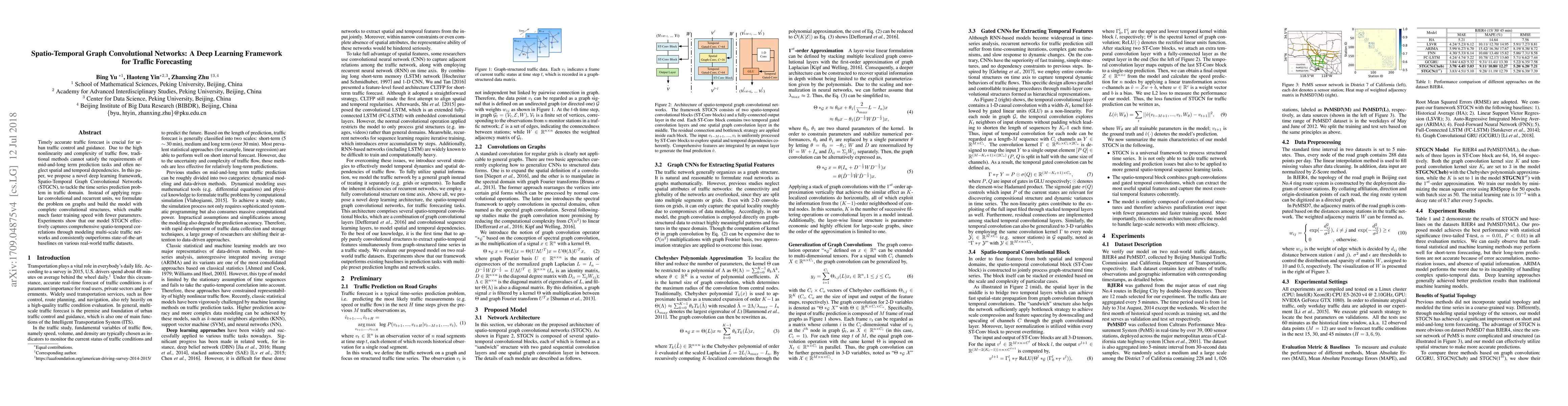 This paper introduces Spatio-Temporal Graph Convolutional Networks (STGCN), a novel deep learning framework for accurate mid-and-long term traffic forecasting by capturing spatial and temporal dependencies in traffic flow. The proposed model outperforms existing methods by leveraging graph convolutional structures for faster training and better performance.