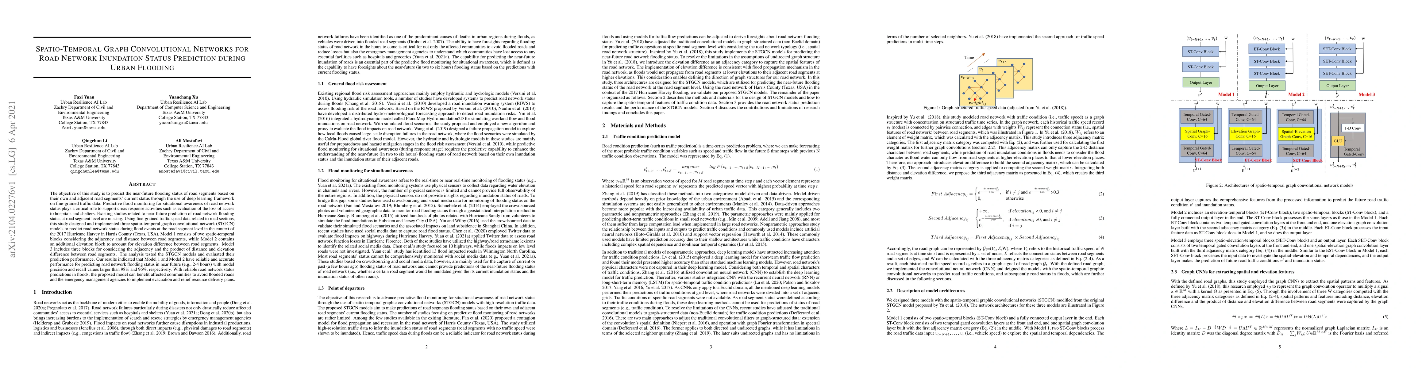 This study develops spatio-temporal graph convolutional networks (STGCN) to predict road network flooding status during urban floods using traffic data. Models 1 and 2 show high accuracy (precision > 98%, recall > 96%) in forecasting road segment flooding, aiding crisis response and resource allocation.