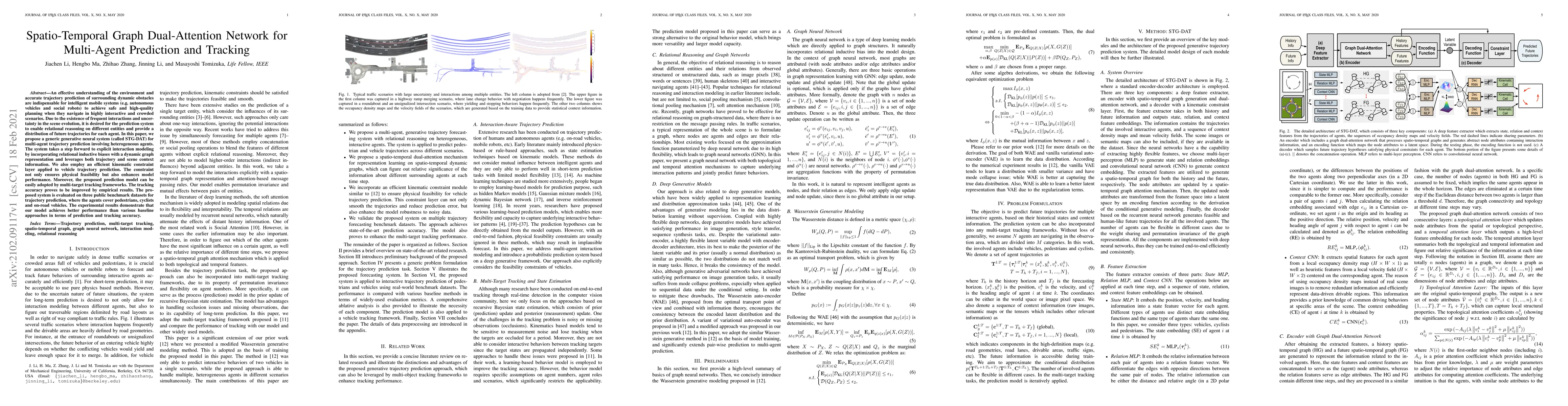 The paper proposes a Spatio-Temporal Graph Dual-Attention Network (STG-DAT) for multi-agent prediction and tracking, leveraging dynamic graph representation and relational inductive biases to model interactions and predict future trajectories. The model also incorporates kinematic constraints to improve accuracy and is shown to outperform baselines on public datasets.