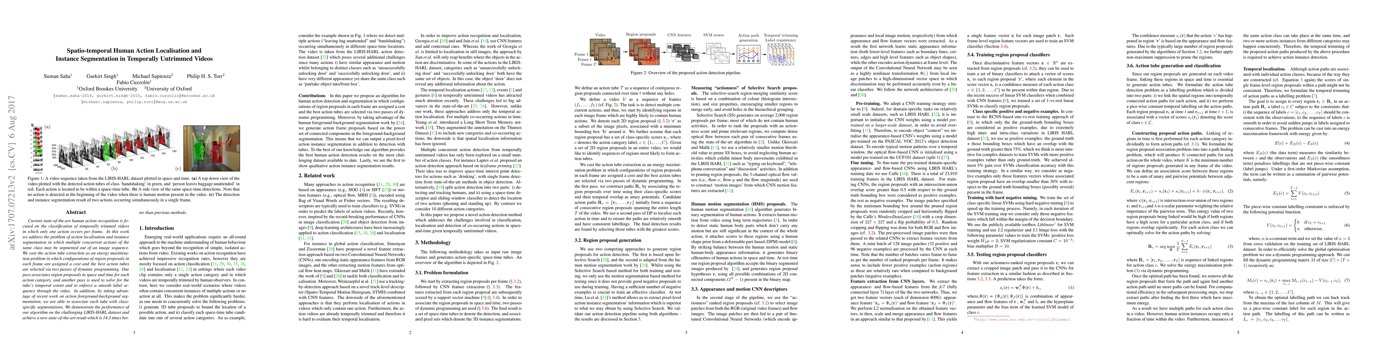 Current state-of-the-art human action recognition is focused on the classification of temporally trimmed videos in which only one action occurs per frame. In this work we address the problem of action localisation and instance segmentation in which multiple concurrent actions of the same class may be segmented out of an image sequence. We cast the action tube extraction as an energy maximisation problem in which configurations of region proposals in each frame are assigned a cost and the best action tubes are selected via two passes of dynamic programming. One pass associates region proposals in space and time for each action category, and another pass is used to solve for the tube's temporal extent and to enforce a smooth label sequence through the video. In addition, by taking advantage of recent work on action foreground-background segmentation, we are able to associate each tube with class-specific segmentations. We demonstrate the performance of our algorithm on the challenging LIRIS-HARL dataset and achieve a new state-of-the-art result which is 14.3 times better than previous methods.