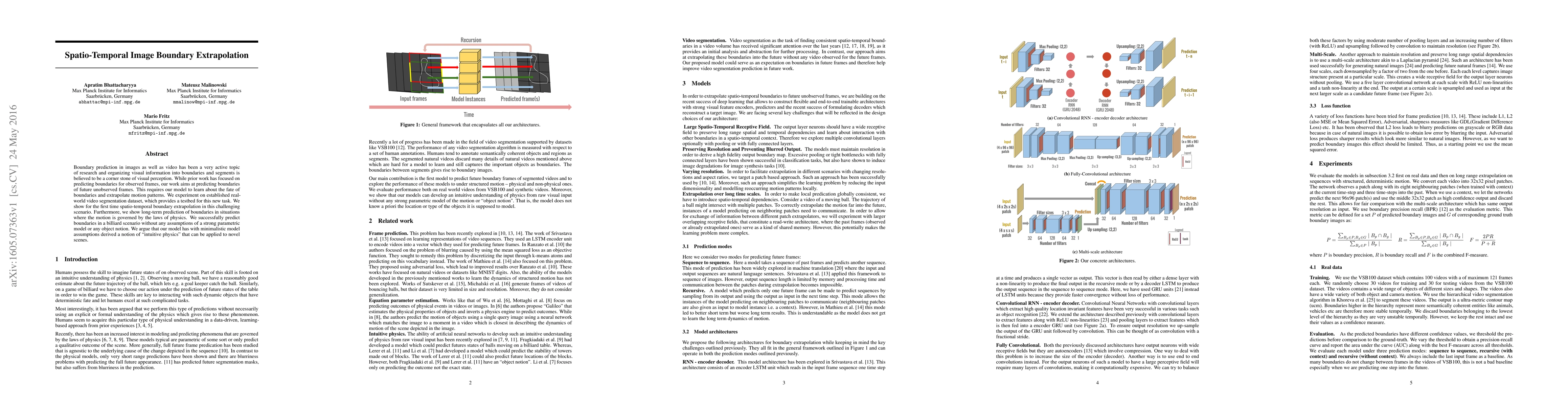 Boundary prediction in images as well as video has been a very active topic of research and organizing visual information into boundaries and segments is believed to be a corner stone of visual perception. While prior work has focused on predicting boundaries for observed frames, our work aims at predicting boundaries of future unobserved frames. This requires our model to learn about the fate of boundaries and extrapolate motion patterns. We experiment on established real-world video segmentation dataset, which provides a testbed for this new task. We show for the first time spatio-temporal boundary extrapolation in this challenging scenario. Furthermore, we show long-term prediction of boundaries in situations where the motion is governed by the laws of physics. We successfully predict boundaries in a billiard scenario without any assumptions of a strong parametric model or any object notion. We argue that our model has with minimalistic model assumptions derived a notion of 'intuitive physics' that can be applied to novel scenes.