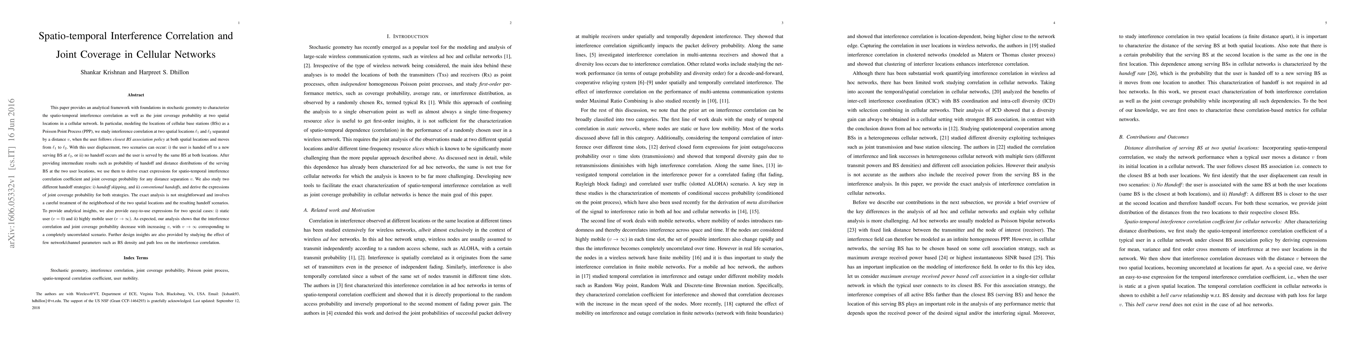 This paper develops an analytical framework using stochastic geometry to characterize spatio-temporal interference correlation and joint coverage probability in cellular networks. It models base stations as a Poisson Point Process, examining interference correlation and coverage scenarios under different handoff strategies as users move between locations.