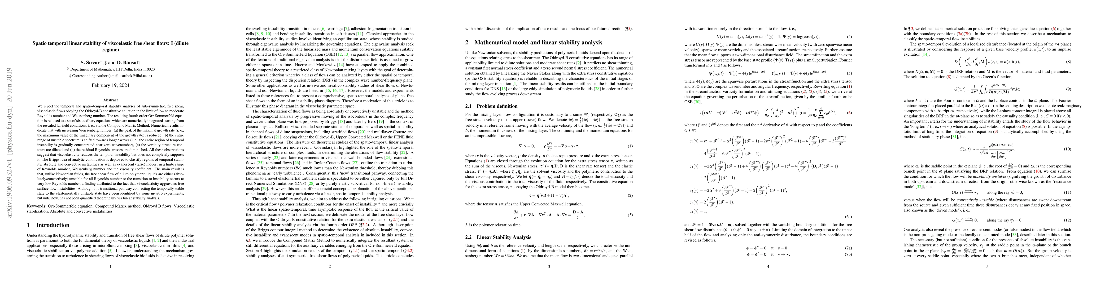 We report the temporal and spatio-temporal stability analyses of anti-symmetric, free shear, viscoelastic flows obeying the Oldroyd-B constitutive equation in the limit of low to moderate Reynolds number and Weissenberg number. The resulting fourth order Orr-Sommerfeld equation is reduced to a set of six auxiliary equations which are numerically integrated starting from the rescaled far-field conditions, i.~e., via the Compound Matrix Method. Numerical results indicate that with increasing Weissenberg number: (a) the peak of the maximal growth rate (i. e., the maximum value of the imaginary component of the growth rate) is reduced, (b) the entire range of unstable spectrum is shifted towards longer waves (i.~e., the entire region of temporal instability is gradually concentrated near zero wavenumber), (c) the vorticity structure contours are dilated and (d) the residual Reynolds stresses are diminished. All these observations suggest that viscoelasticity reduces the temporal instability but does not completely suppress it. The Briggs idea of analytic continuation is deployed to classify regions of temporal stability, absolute and convective instabilties as well as evanescent (false) modes, in a finite range of Reynolds number, Weissenberg number and the viscosity coefficient. The main result is that, unlike Newtonian fluids, the free shear flow of dilute polymeric liquids are either (absolutely/convectively) unstable for all Reynolds number or the transition to instability occurs at very low Reynolds number, a finding attributed to the fact that viscoelasticity aggravates free surface flow instabilities. Although this transitional pathway connecting the temporally stable state to the elastoinertially unstable state have been identified by some in-vitro experiments, but until now, has not been quantified theoretically via linear stability analysis.