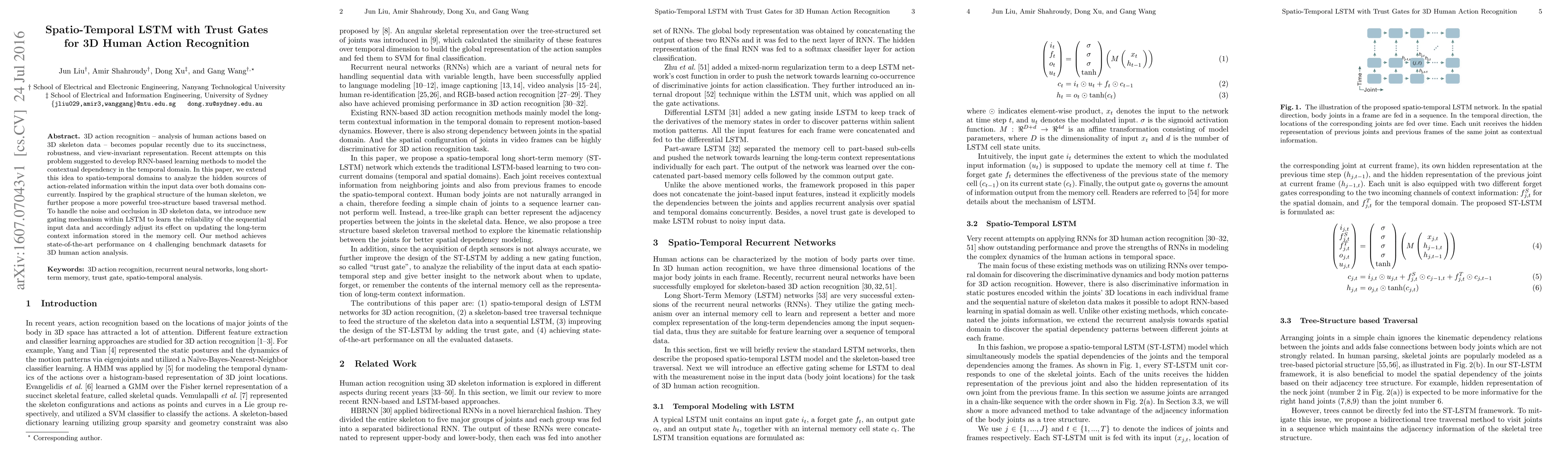 This paper proposes a Spatio-Temporal LSTM with Trust Gates for recognizing 3D human actions using skeleton data. It introduces a tree-structure based traversal method and a gating mechanism to handle noise and occlusion, achieving state-of-the-art results on benchmark datasets.