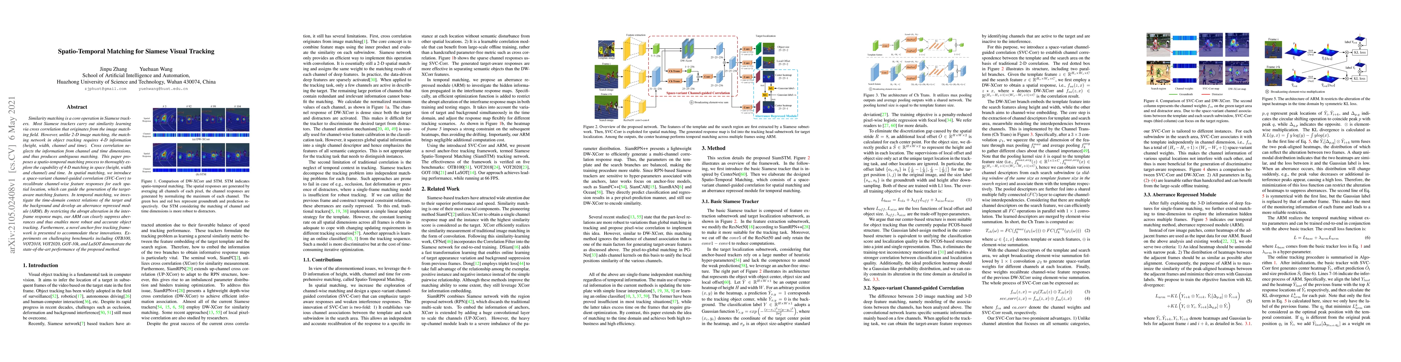 Similarity matching is a core operation in Siamese trackers. Most Siamese trackers carry out similarity learning via cross correlation that originates from the image matching field. However, unlike 2-D image matching, the matching network in object tracking requires 4-D information (height, width, channel and time). Cross correlation neglects the information from channel and time dimensions, and thus produces ambiguous matching. This paper proposes a spatio-temporal matching process to thoroughly explore the capability of 4-D matching in space (height, width and channel) and time. In spatial matching, we introduce a space-variant channel-guided correlation (SVC-Corr) to recalibrate channel-wise feature responses for each spatial location, which can guide the generation of the target-aware matching features. In temporal matching, we investigate the time-domain context relations of the target and the background and develop an aberrance repressed module (ARM). By restricting the abrupt alteration in the interframe response maps, our ARM can clearly suppress aberrances and thus enables more robust and accurate object tracking. Furthermore, a novel anchor-free tracking framework is presented to accommodate these innovations. Experiments on challenging benchmarks including OTB100, VOT2018, VOT2020, GOT-10k, and LaSOT demonstrate the state-of-the-art performance of the proposed method.