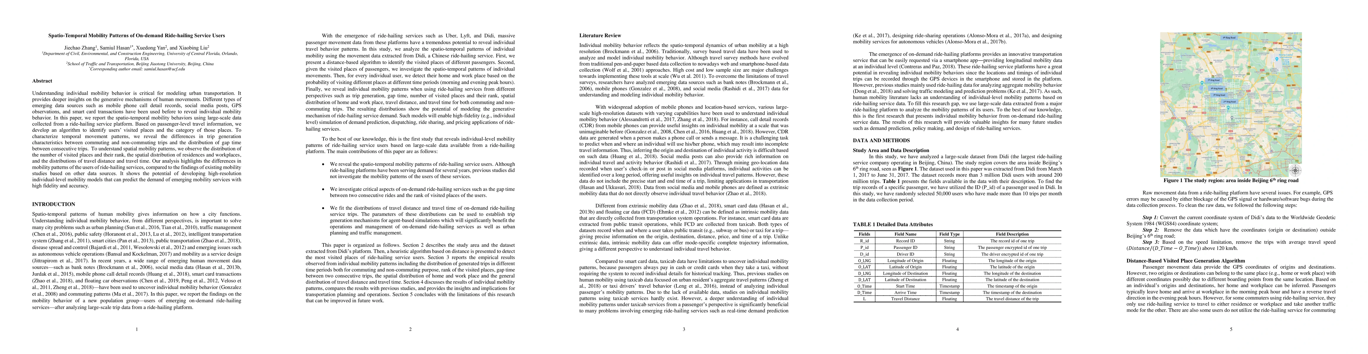 Understanding individual mobility behavior is critical for modeling urban transportation. It provides deeper insights on the generative mechanisms of human movements. Emerging data sources such as mobile phone call detail records, social media posts, GPS observations, and smart card transactions have been used before to reveal individual mobility behavior. In this paper, we report the spatio-temporal mobility behaviors using large-scale data collected from a ride-hailing service platform. Based on passenger-level travel information, we develop an algorithm to identify users' visited places and the category of those places. To characterize temporal movement patterns, we reveal the differences in trip generation characteristics between commuting and non-commuting trips and the distribution of gap time between consecutive trips. To understand spatial mobility patterns, we observe the distribution of the number of visited places and their rank, the spatial distribution of residences and workplaces, and the distributions of travel distance and travel time. Our analysis highlights the differences in mobility patterns of the users of ride-hailing services, compared to the findings of existing mobility studies based on other data sources. It shows the potential of developing high-resolution individual-level mobility models that can predict the demand of emerging mobility services with high fidelity and accuracy.
