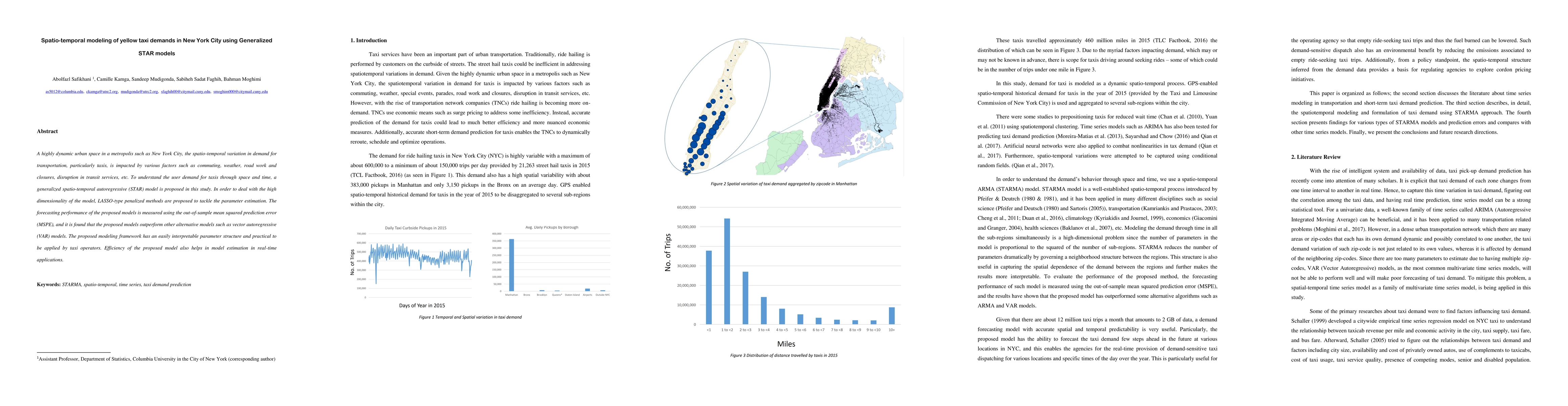 This study introduces a generalized spatio-temporal autoregressive (STAR) model to predict yellow taxi demand in NYC, considering factors like commuting patterns, weather, and road disruptions. The model, employing LASSO-type penalized methods for parameter estimation, outperforms alternatives like VAR models in forecast accuracy and offers real-time applicability for taxi operators.
