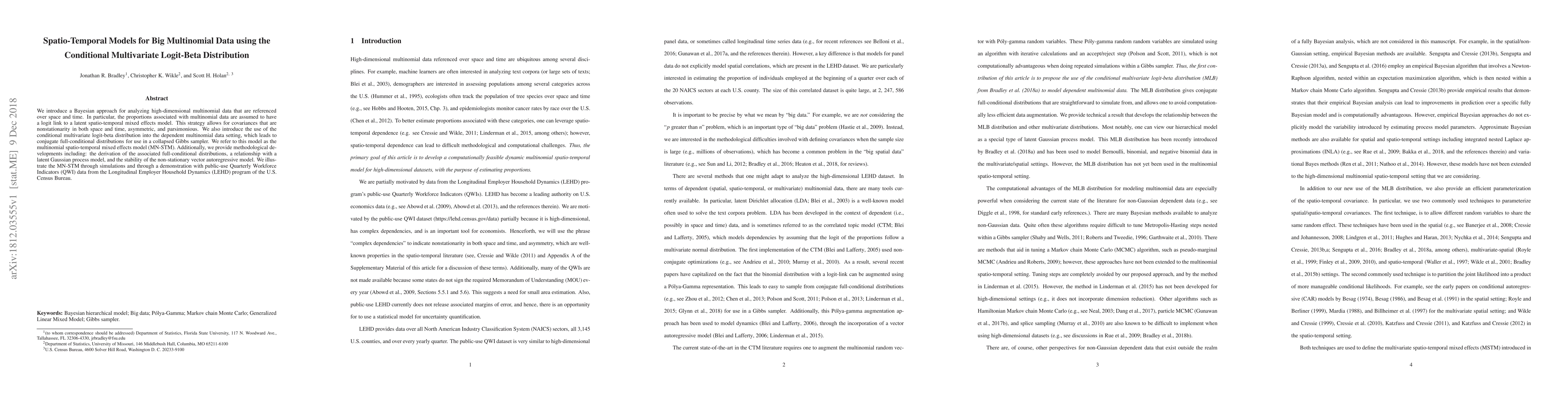 This paper proposes a Bayesian spatio-temporal model for high-dimensional multinomial data using the conditional multivariate logit-beta distribution, allowing for nonstationary, asymmetric covariances. The model, termed MN-STM, employs a collapsed Gibbs sampler for efficient computation and is demonstrated through simulations and real-world data from the U.S. Census Bureau.