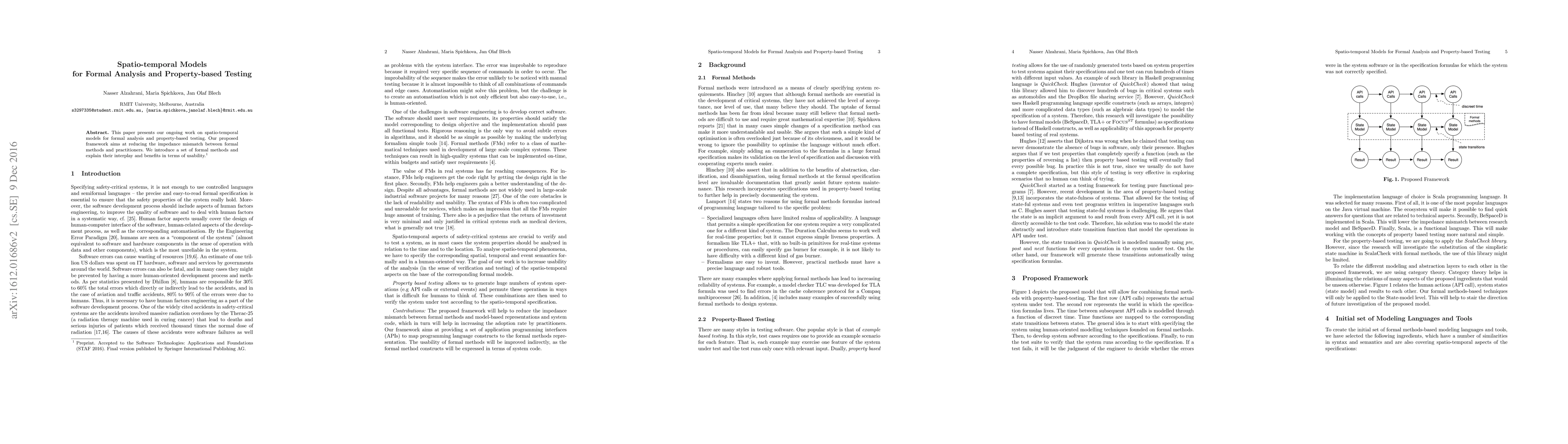 This paper presents our ongoing work on spatio-temporal models for formal analysis and property-based testing. Our proposed framework aims at reducing the impedance mismatch between formal methods and practitioners. We introduce a set of formal methods and explain their interplay and benefits in terms of usability.