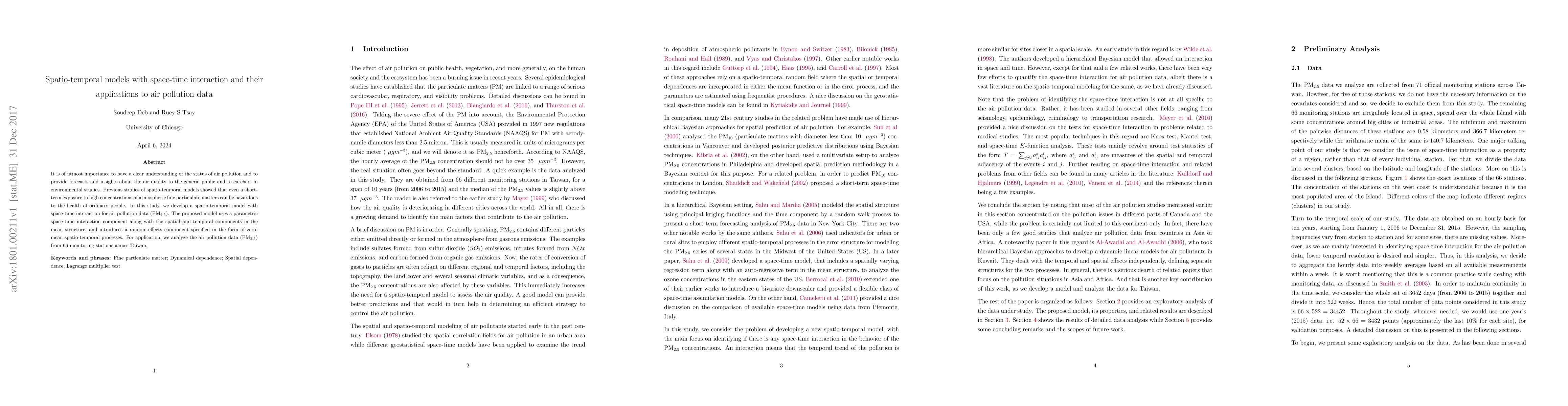 This paper develops a spatio-temporal model incorporating space-time interaction to analyze and forecast air pollution data, specifically PM2.5 levels, from 66 monitoring stations in Taiwan, aiming to provide insights into air quality for public health and environmental research.