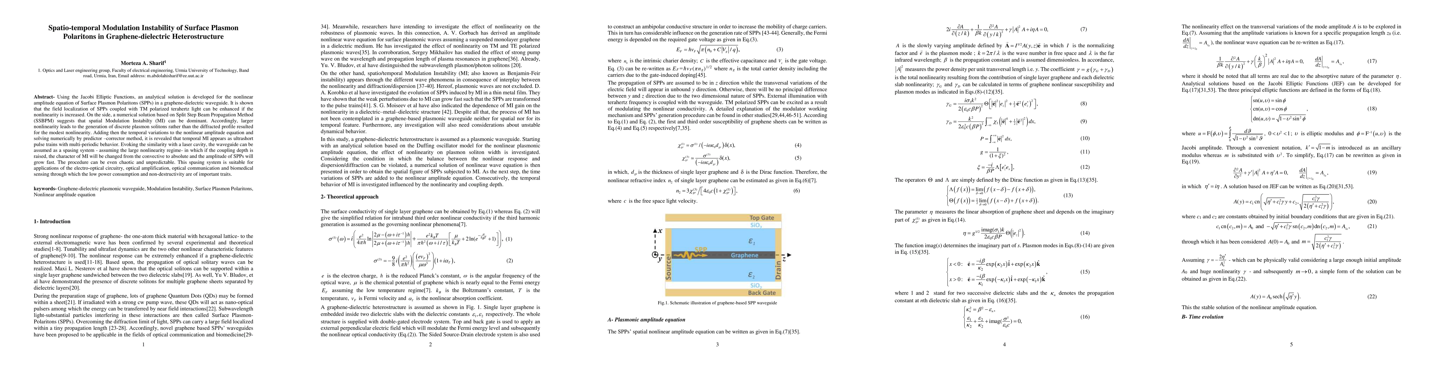 Using the Jacobi Elliptic Functions, an analytical solution is developed for the nonlinear amplitude equation of Surface Plasmon Polaritons (SPPs) in a graphene-dielectric waveguide. It is shown that the field localization of SPPs coupled with TM polarized terahertz light can be enhanced if the nonlinearity is increased. On the side, a numerical solution based on Split Step Beam Propagation Method (SSBPM) suggests that spatial Modulation Instabilty (MI) can be dominant. Accordingly, larger nonlinearity leads to the generation of discrete plasmon solitons rather than the diffracted profile resulted for the modest nonlinearity. Adding then the temporal variations to the nonlinear amplitude equation and solving numerically by predictor-corrector method, it is revealed that temporal MI appears as ultrashort pulse trains with multi-periodic behavior. Evoking the similarity with a laser cavity, the waveguide can be assumed as a spasing system-assuming the large nonlinearity regime-in which if the coupling depth is raised, the character of MI will be changed from the convective to absolute and the amplitude of SPPs will grow fast. The procedure can be even chaotic and unpredictable. This spasing system is suitable for applications of the electro-optical circuitry, optical amplification, optical communication and biomedical sensing through which the low power consumption and non-destructivity are of important traits.