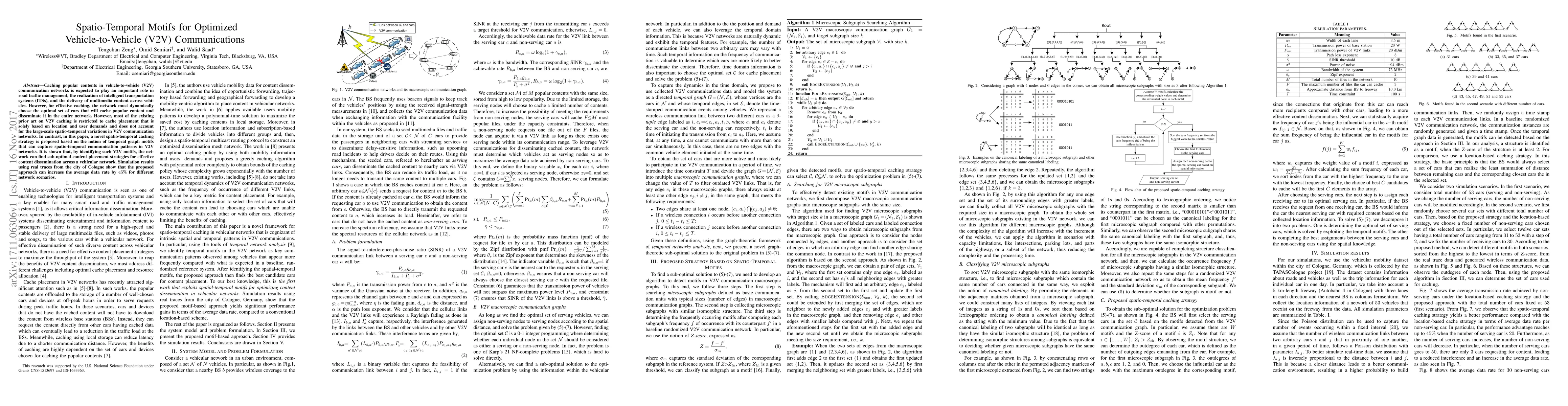 This paper proposes a novel spatio-temporal caching strategy for vehicle-to-vehicle (V2V) communications using temporal graph motifs to capture communication patterns. The approach enhances content dissemination efficiency and increases average data rates by 45% in simulations using real city traffic data.
