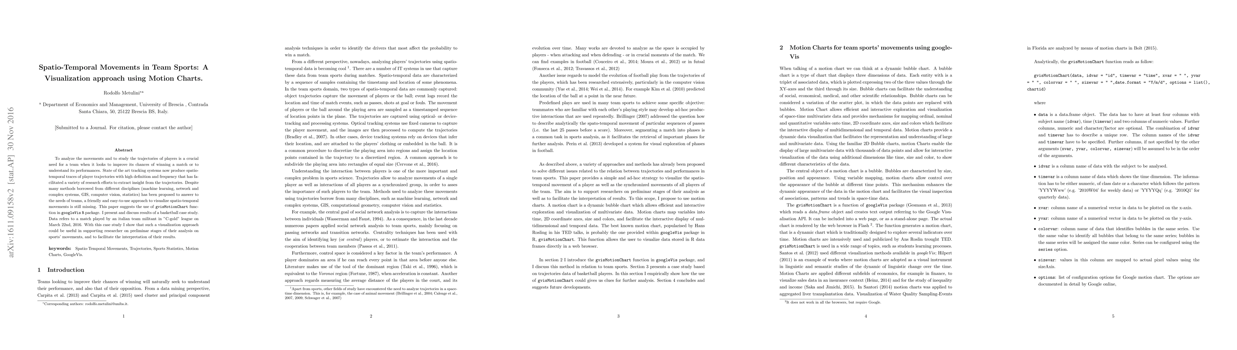 This paper proposes a visualization approach using GoogleVis R package's gvisMotionChart function to analyze and visualize spatio-temporal movements of players in team sports. A case study on a basketball match demonstrates the utility of this method in supporting preliminary analysis and interpretation of player trajectories.
