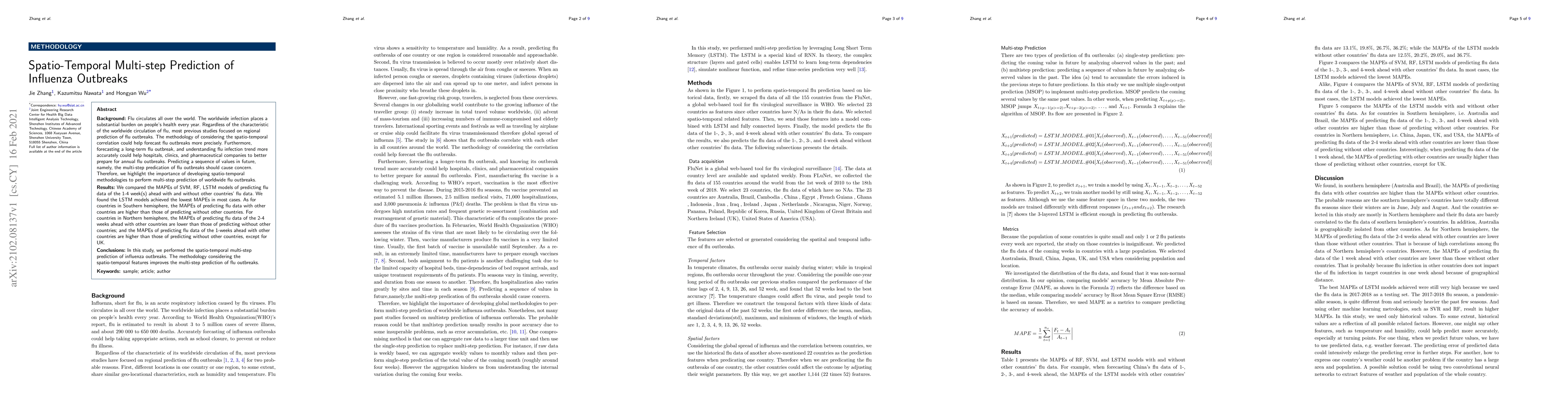 This research develops spatio-temporal methodologies for multi-step prediction of worldwide flu outbreaks, comparing the performance of SVM, RF, and LSTM models. The LSTM model achieved the lowest prediction errors for most cases, highlighting the importance of considering global flu data for accurate forecasting.