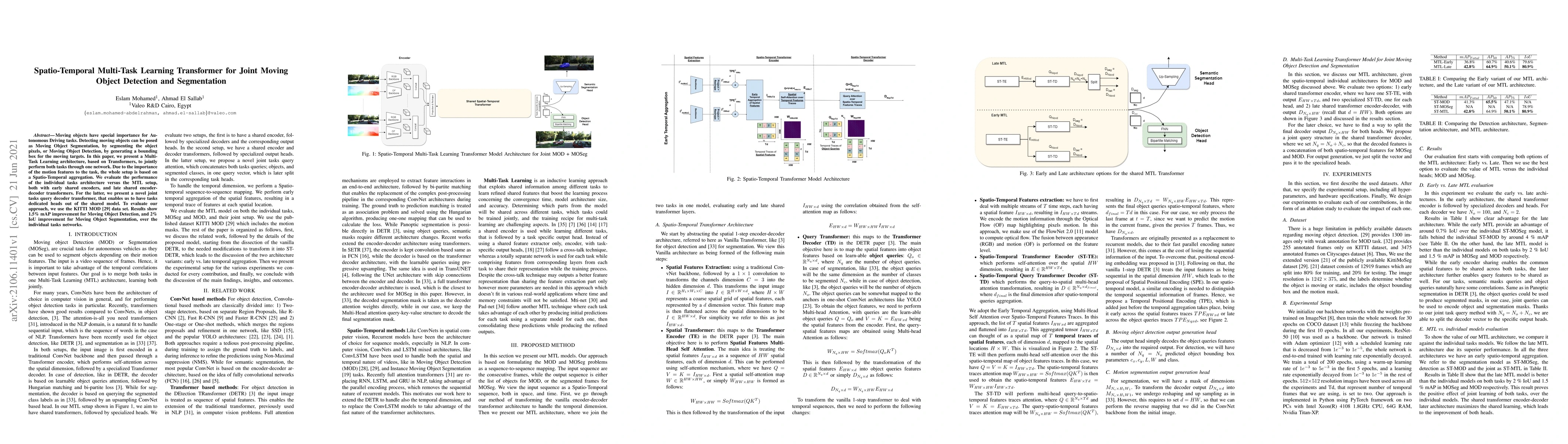 This paper proposes a Multi-Task Learning Transformer for jointly detecting and segmenting moving objects in autonomous driving. The approach uses a Spatio-Temporal aggregation and shows a 1.5% mAP improvement for detection and a 2% IoU improvement for segmentation compared to individual task networks.