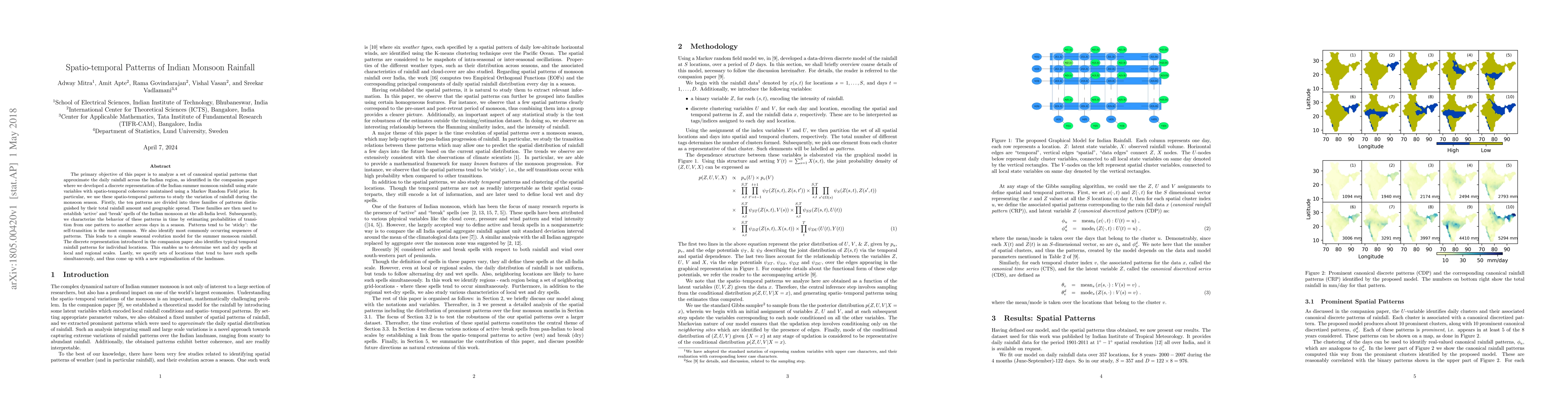 This paper analyzes spatial patterns of Indian monsoon rainfall, categorizing them into three families based on rainfall amount and geographic spread. It identifies "active" and "break" spells of monsoon using these patterns and models the seasonal evolution of monsoon rainfall, revealing sticky transitions and common pattern sequences.