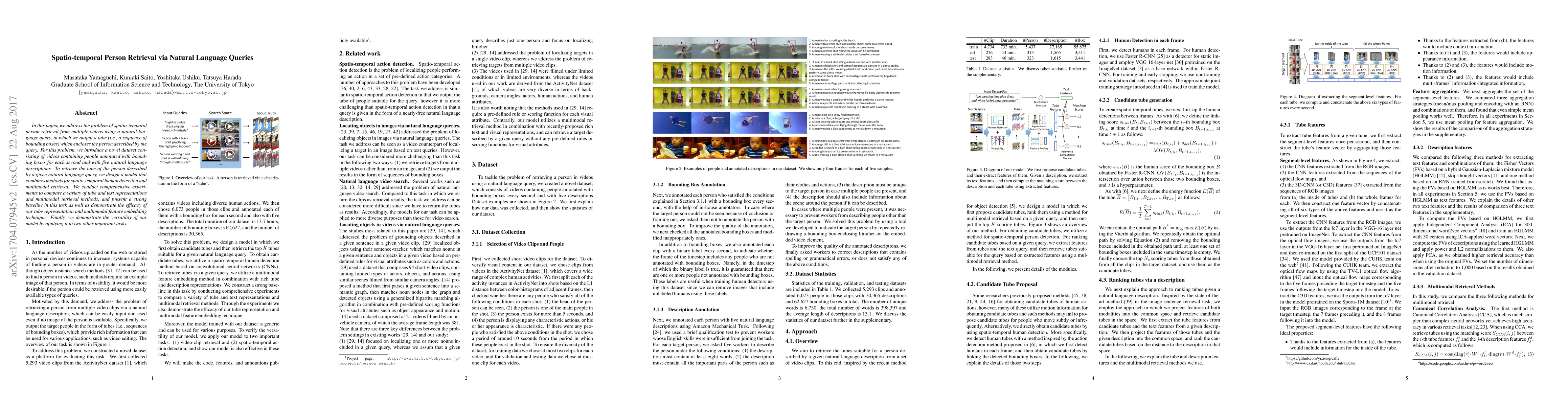 This paper introduces a novel dataset and model for spatio-temporal person retrieval from videos using natural language queries, combining human detection and multimodal retrieval techniques. The model outputs a tube of bounding boxes and demonstrates strong performance in experiments.