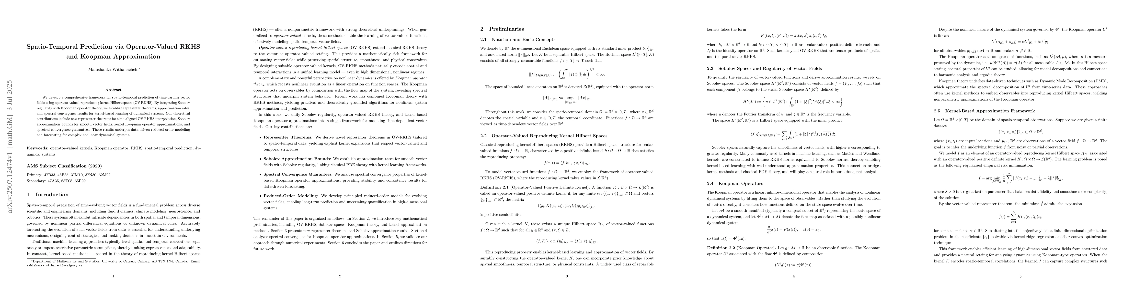 We develop a comprehensive framework for spatio-temporal prediction of time-varying vector fields using operator-valued reproducing kernel Hilbert spaces (OV RKHS). By integrating Sobolev regularity with Koopman operator theory, we establish representer theorems, approximation rates, and spectral convergence results for kernel-based learning of dynamical systems. Our theoretical contributions include new representer theorems for time-aligned OV RKHS interpolation, Sobolev approximation bounds for smooth vector fields, kernel Koopman operator approximations, and spectral convergence guarantees. These results underpin data-driven reduced-order modeling and forecasting for complex nonlinear dynamical systems.