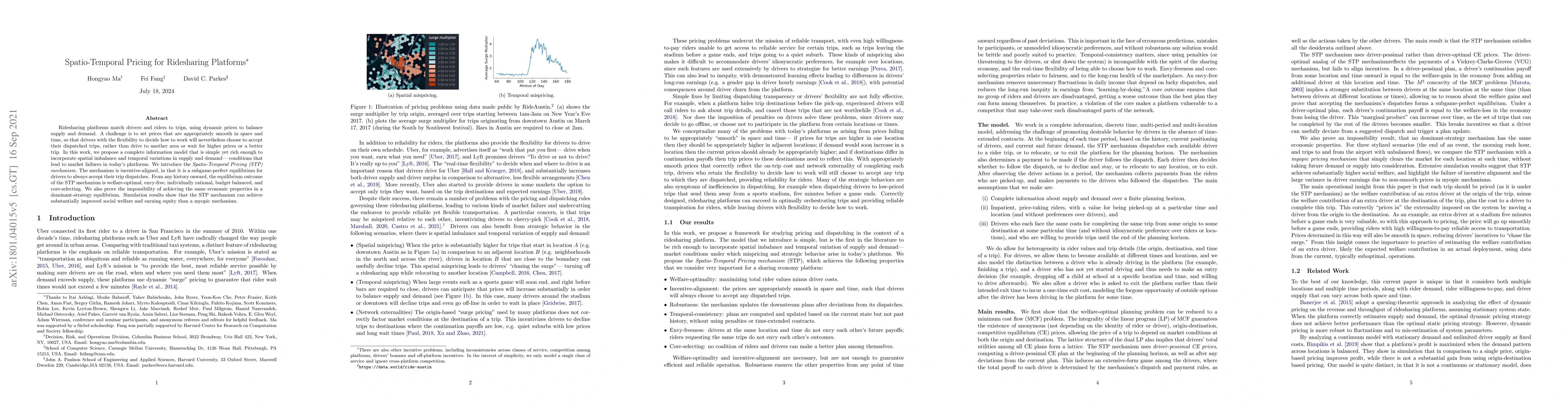 This paper proposes a Spatio-Temporal Pricing (STP) mechanism for ridesharing platforms to balance supply and demand dynamically, ensuring smooth pricing in space and time. The STP mechanism is incentive-aligned and achieves optimal welfare, envy-freeness, and other economic properties, outperforming myopic pricing methods in simulations.