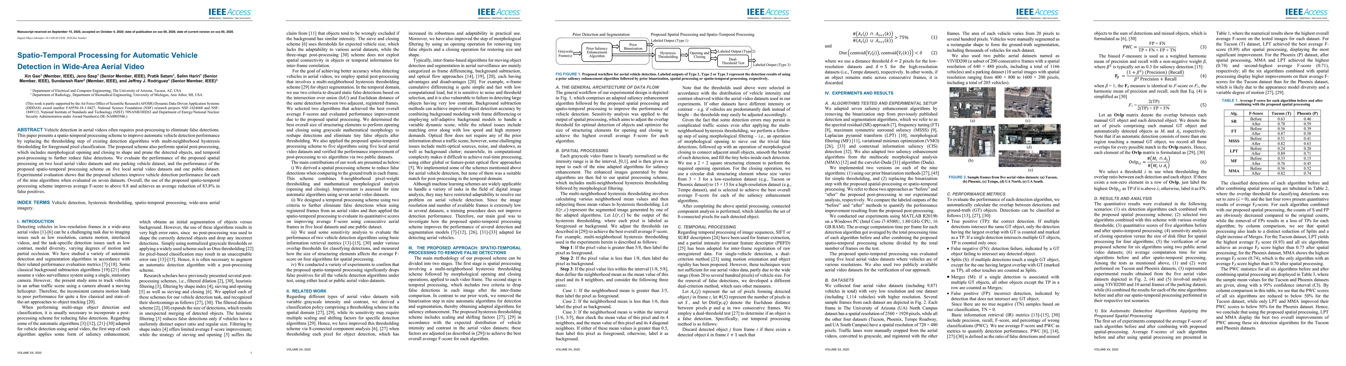 This paper proposes a spatio-temporal processing scheme to enhance automatic vehicle detection in aerial videos, replacing traditional thresholding with multi-neighborhood hysteresis thresholding and incorporating spatial and temporal post-processing to reduce false detections. Experimental results show significant improvements in detection performance across multiple datasets.
