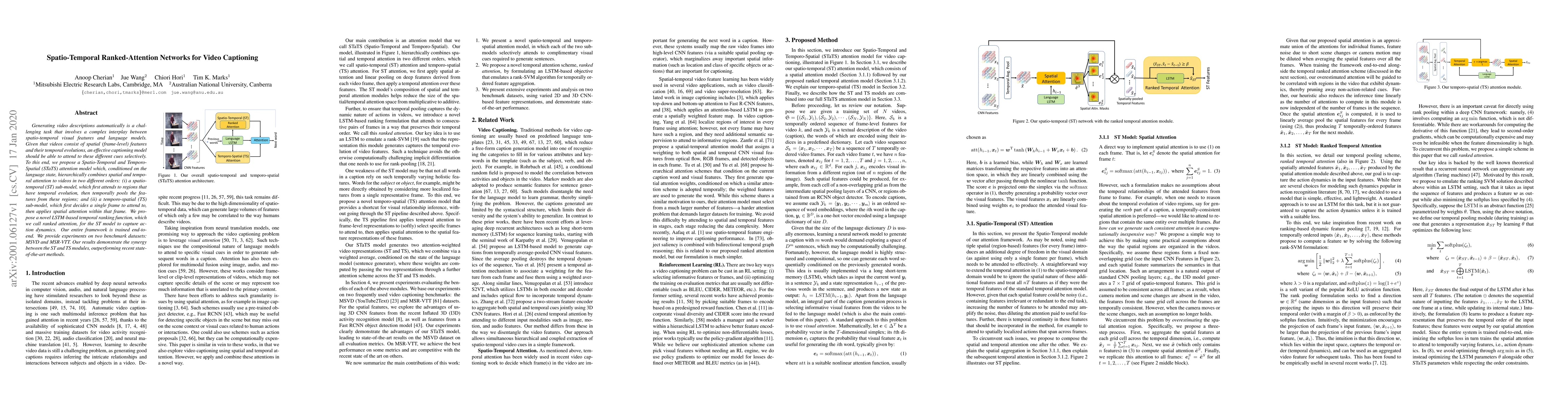 This paper proposes a Spatio-Temporal and Temporo-Spatial (STaTS) attention model for video captioning, combining spatial and temporal features in two hierarchical orders. The model employs an LSTM-based temporal ranking function to capture action dynamics, achieving superior performance on MSVD and MSR-VTT datasets compared to recent methods.