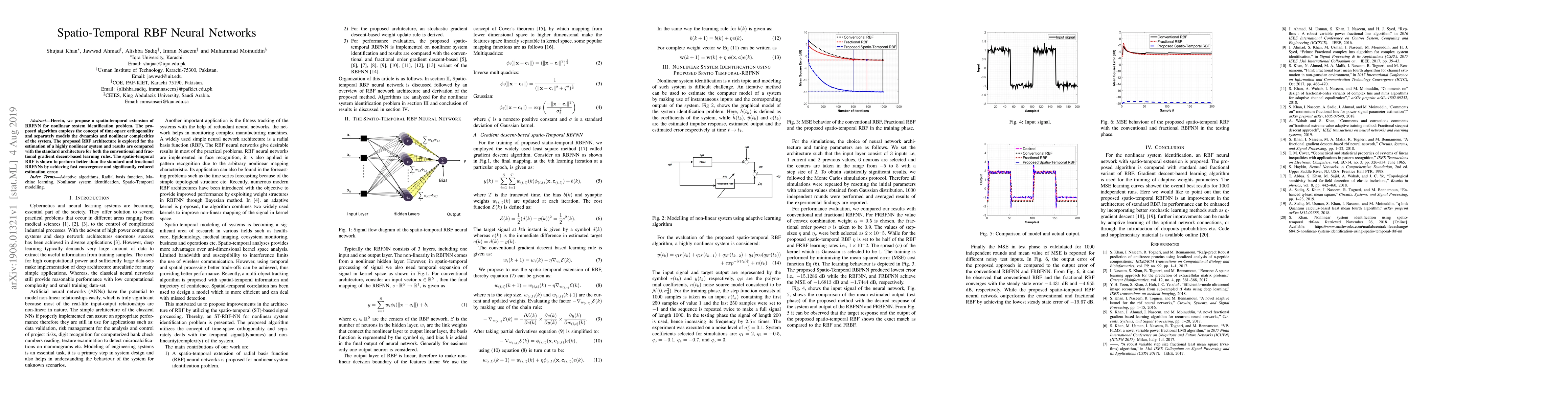This paper proposes a spatio-temporal extension of Radial Basis Function Neural Networks (RBFNN) for identifying nonlinear systems, utilizing time-space orthogonality to separately model system dynamics and complexities. The new RBF architecture demonstrates faster convergence and lower estimation error compared to standard and fractional RBFNNs.