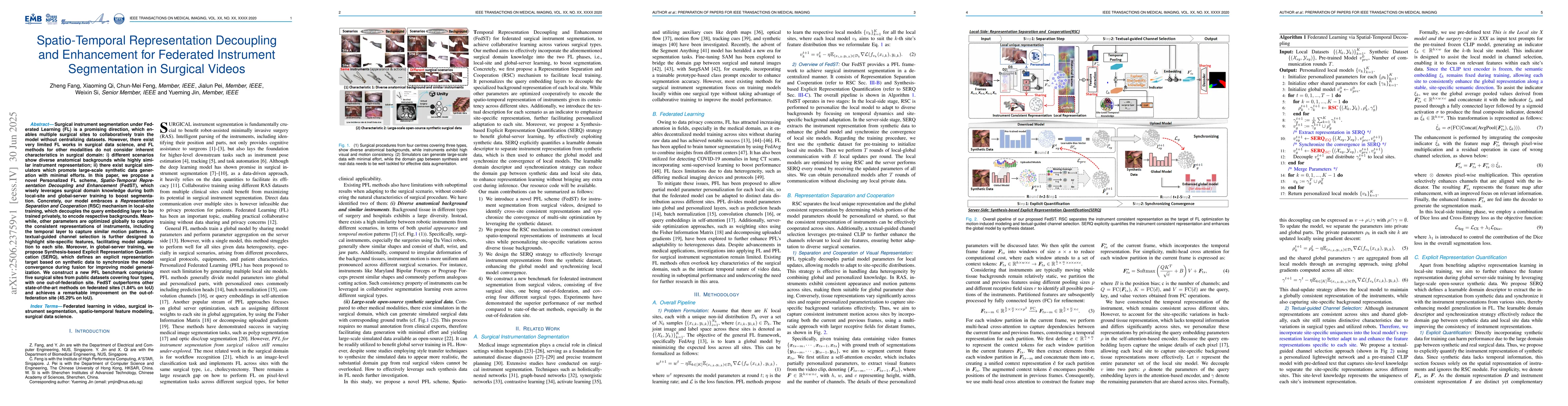 Surgical instrument segmentation under Federated Learning (FL) is a promising direction, which enables multiple surgical sites to collaboratively train the model without centralizing datasets. However, there exist very limited FL works in surgical data science, and FL methods for other modalities do not consider inherent characteristics in surgical domain: i) different scenarios show diverse anatomical backgrounds while highly similar instrument representation; ii) there exist surgical simulators which promote large-scale synthetic data generation with minimal efforts. In this paper, we propose a novel Personalized FL scheme, Spatio-Temporal Representation Decoupling and Enhancement (FedST), which wisely leverages surgical domain knowledge during both local-site and global-server training to boost segmentation. Concretely, our model embraces a Representation Separation and Cooperation (RSC) mechanism in local-site training, which decouples the query embedding layer to be trained privately, to encode respective backgrounds. Meanwhile, other parameters are optimized globally to capture the consistent representations of instruments, including the temporal layer to capture similar motion patterns. A textual-guided channel selection is further designed to highlight site-specific features, facilitating model adapta tion to each site. Moreover, in global-server training, we propose Synthesis-based Explicit Representation Quantification (SERQ), which defines an explicit representation target based on synthetic data to synchronize the model convergence during fusion for improving model generalization.