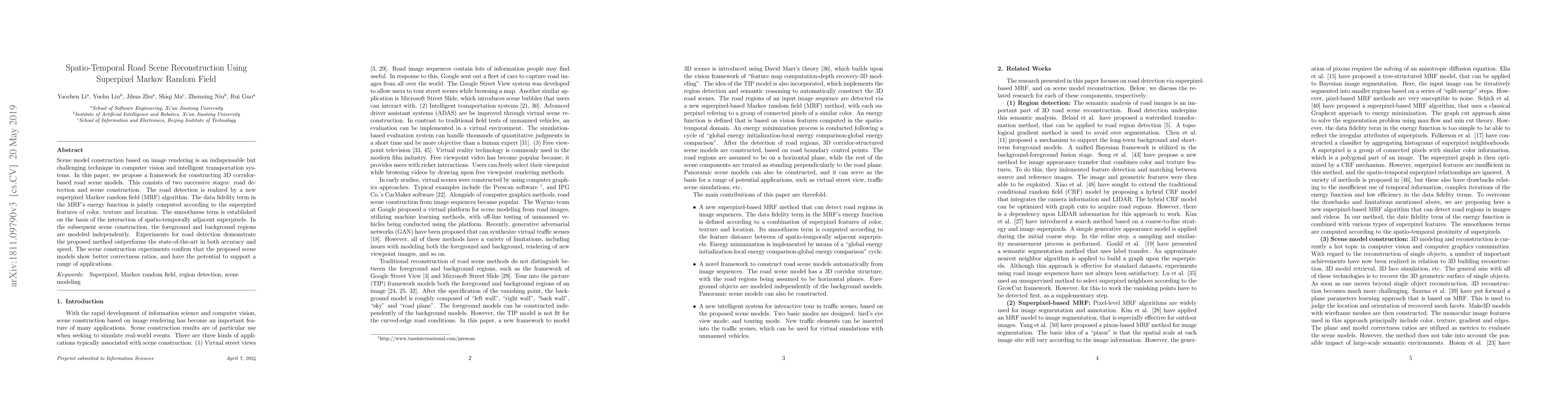 Scene model construction based on image rendering is an indispensable but challenging technique in computer vision and intelligent transportation systems. In this paper, we propose a framework for constructing 3D corridor-based road scene models. This consists of two successive stages: road detection and scene construction. The road detection is realized by a new superpixel Markov random field (MRF) algorithm. The data fidelity term in the MRF's energy function is jointly computed according to the superpixel features of color, texture and location. The smoothness term is established on the basis of the interaction of spatio-temporally adjacent superpixels. In the subsequent scene construction, the foreground and background regions are modeled independently. Experiments for road detection demonstrate the proposed method outperforms the state-of-the-art in both accuracy and speed. The scene construction experiments confirm that the proposed scene models show better correctness ratios, and have the potential to support a range of applications.