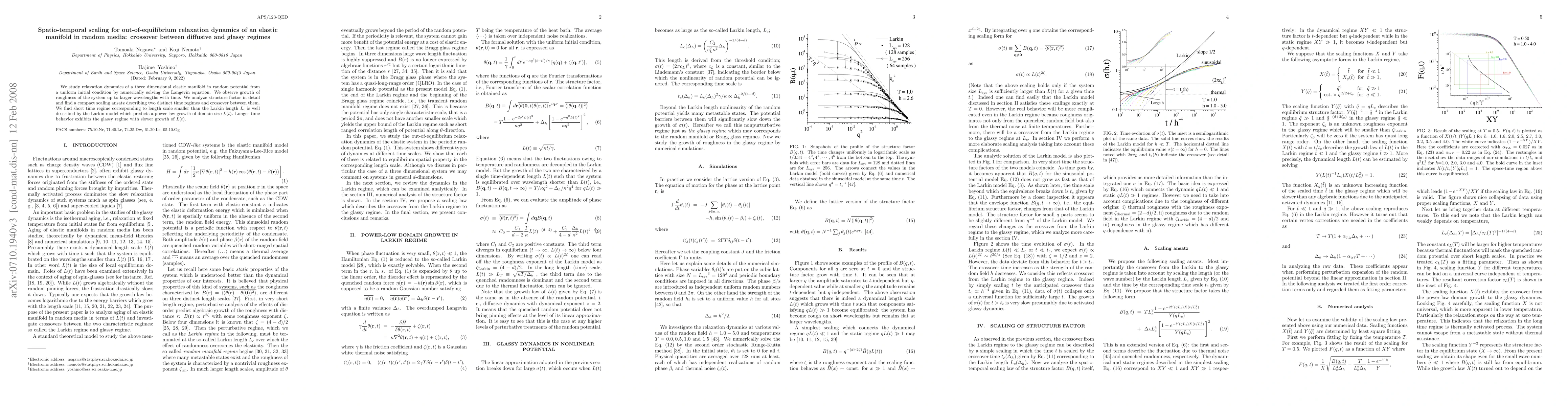 We study relaxation dynamics of a three dimensional elastic manifold in random potential from a uniform initial condition by numerically solving the Langevin equation.We observe growth of roughness of the system up to larger wavelengths with time.We analyze structure factor in detail and find a compact scaling ansatz describing two distinct time regimes and crossover between them. We find short time regime corresponding to length scale smaller than the Larkin length $L_c$ is well described by the Larkin model which predicts a power law growth of domain size $L(t)$. Longer time behavior exhibits the random manifold regime with slower growth of $L(t)$.