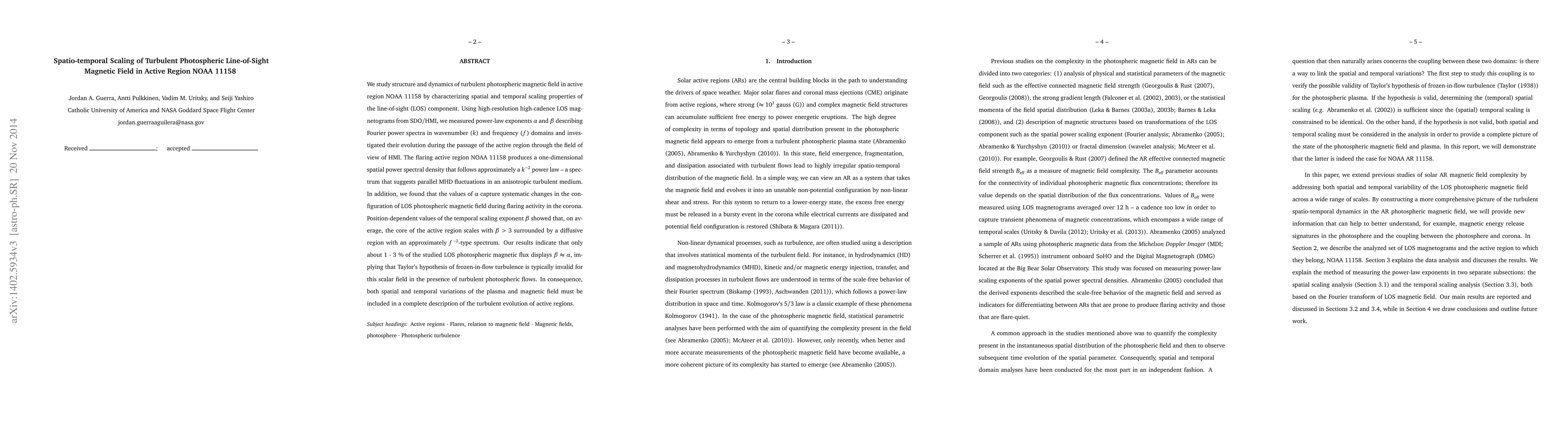 We study structure and dynamics of the turbulent photospheric magnetic field in the active region NOAA 11158 by characterizing the spatial and temporal scaling properties of the line-of-sight (LOS) component. Using high-resolution high-cadence LOS magnetograms from SDO/HMI, we measured power-law exponents $\alpha$ and $\beta$ describing wavenumber- ($k$) and frequency-domain ($f$) Fourier power spectra, respectively, and investigated their evolution during the passage of the active region through the field of view of HMI. Flaring active region NOAA 11158 produces an average one-dimensional spatial power spectral density that follows approximately a $k^{-2}$ power law -- a spectrum that suggests parallel MHD fluctuations in an anisotropic turbulent medium. In addition, we found that values of $\alpha$ capture systematic changes in the configuration of LOS photospheric magnetic field during flaring activity in the corona. Position-dependent values of the temporal scaling exponent $\beta$ showed that, on average, the core of the active region scales with $\beta >$ 3 surrounded by a diffusive region with an approximately $f^{-2}$-type spectrum. Our results indicate that only about 1 - 3 \% of the studied LOS photospheric magnetic flux displays $\beta\approx\alpha$, implying that Taylor's hypothesis of frozen-in-flow turbulence is typically invalid for this scalar in presence of turbulent photospheric flows. In consequence, both spatial and temporal variations of the plasma and magnetic field must be included in a complete description of the turbulent evolution of active regions.