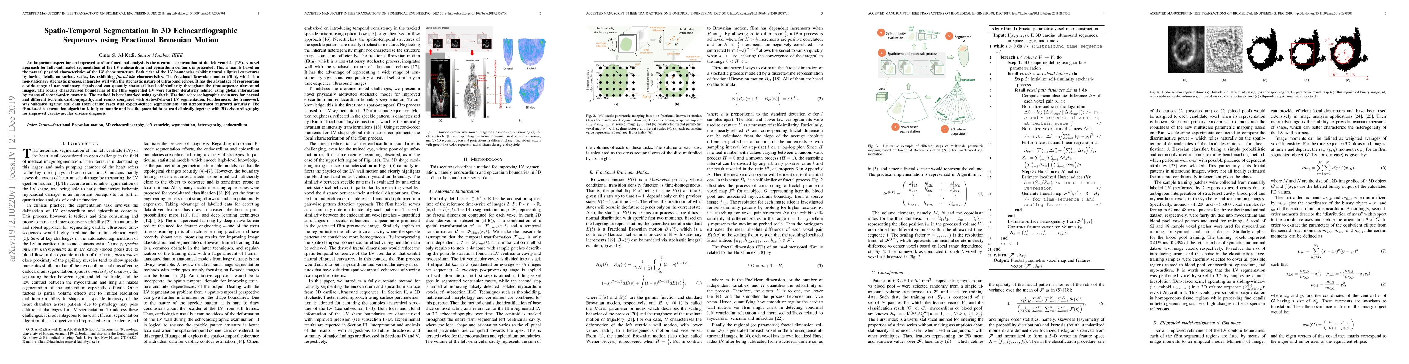 An important aspect for an improved cardiac functional analysis is the accurate segmentation of the left ventricle (LV). A novel approach for fully-automated segmentation of the LV endocardium and epicardium contours is presented. This is mainly based on the natural physical characteristics of the LV shape structure. Both sides of the LV boundaries exhibit natural elliptical curvatures by having details on various scales, i.e. exhibiting fractal-like characteristics. The fractional Brownian motion (fBm), which is a non-stationary stochastic process, integrates well with the stochastic nature of ultrasound echoes. It has the advantage of representing a wide range of non-stationary signals and can quantify statistical local self-similarity throughout the time-sequence ultrasound images. The locally characterized boundaries of the fBm segmented LV were further iteratively refined using global information by means of second-order moments. The method is benchmarked using synthetic 3D+time echocardiographic sequences for normal and different ischemic cardiomyopathy, and results compared with state-of-the-art LV segmentation. Furthermore, the framework was validated against real data from canine cases with expert-defined segmentations and demonstrated improved accuracy. The fBm-based segmentation algorithm is fully automatic and has the potential to be used clinically together with 3D echocardiography for improved cardiovascular disease diagnosis.