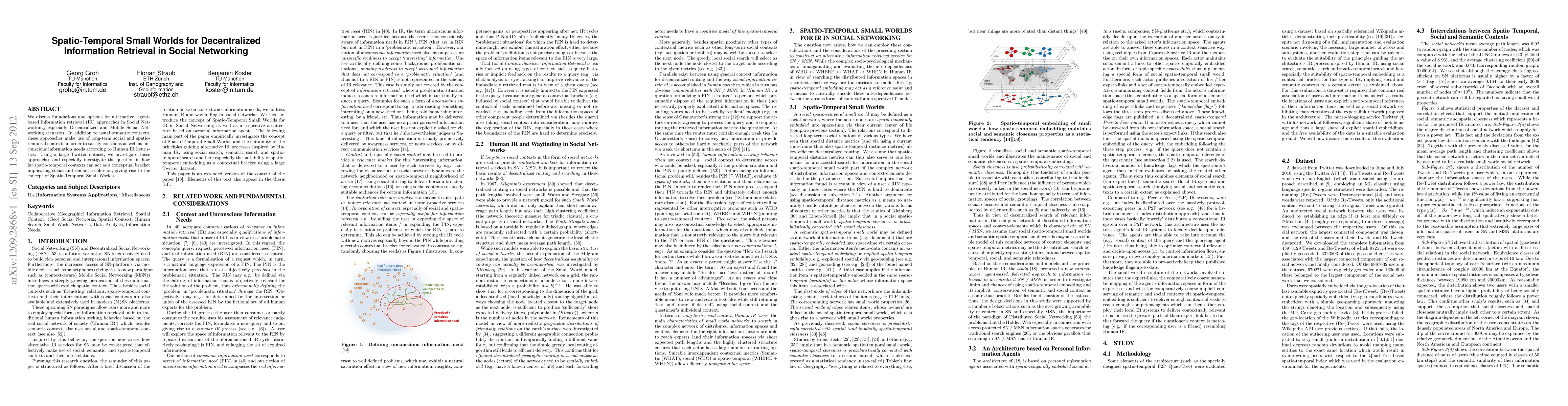 We discuss foundations and options for alternative, agent-based information retrieval (IR) approaches in Social Networking, especially Decentralized and Mobile Social Networking scenarios. In addition to usual semantic contexts, these approaches make use of long-term social and spatio-temporal contexts in order to satisfy conscious as well as unconscious information needs according to Human IR heuristics. Using a large Twitter dataset, we investigate these approaches and especially investigate the question in how far spatio-temporal contexts can act as a conceptual bracket implicating social and semantic cohesion, giving rise to the concept of Spatio-Temporal Small Worlds.