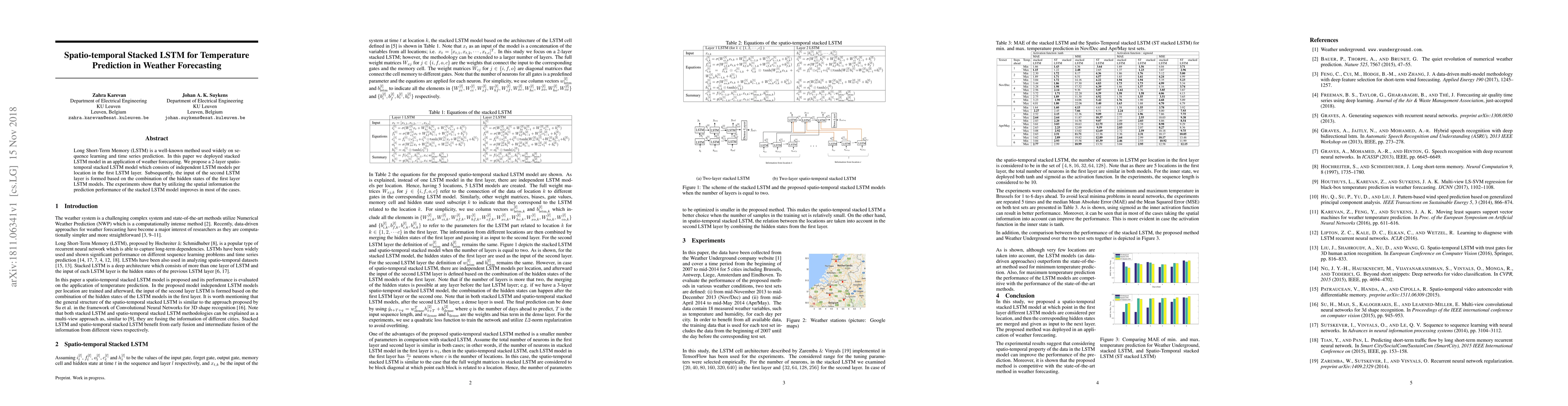Long Short-Term Memory (LSTM) is a well-known method used widely on sequence learning and time series prediction. In this paper we deployed stacked LSTM model in an application of weather forecasting. We propose a 2-layer spatio-temporal stacked LSTM model which consists of independent LSTM models per location in the first LSTM layer. Subsequently, the input of the second LSTM layer is formed based on the combination of the hidden states of the first layer LSTM models. The experiments show that by utilizing the spatial information the prediction performance of the stacked LSTM model improves in most of the cases.