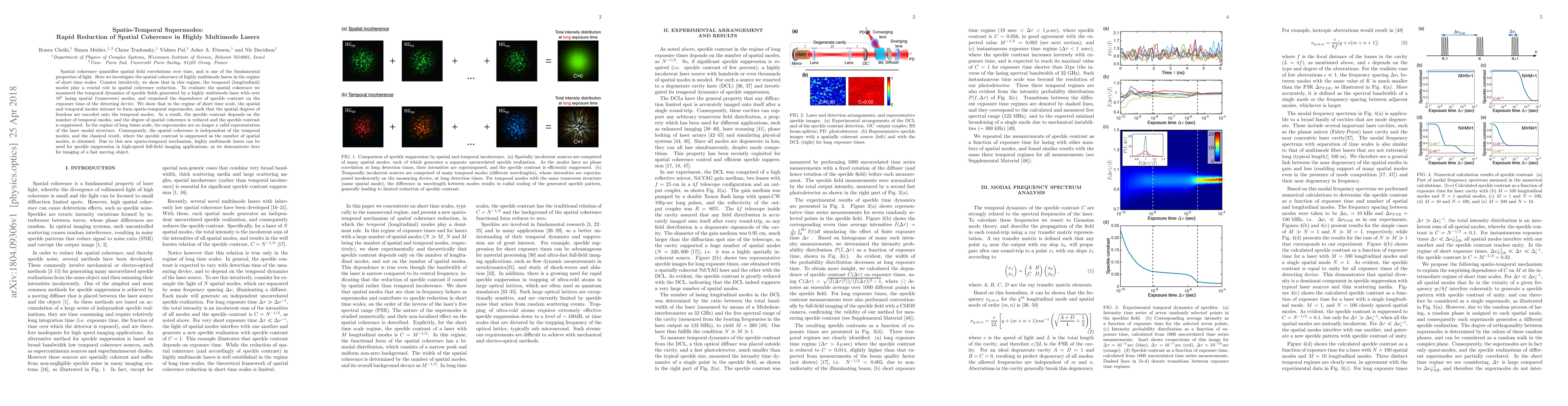 This paper explores how spatial coherence in highly multimode lasers is rapidly reduced by spatio-temporal supermodes, where temporal modes influence spatial coherence on short time scales. The study demonstrates that these supermodes enable speckle suppression in high-speed imaging applications, contrasting with long-time scale behavior where spatial coherence depends solely on the number of spatial modes.
