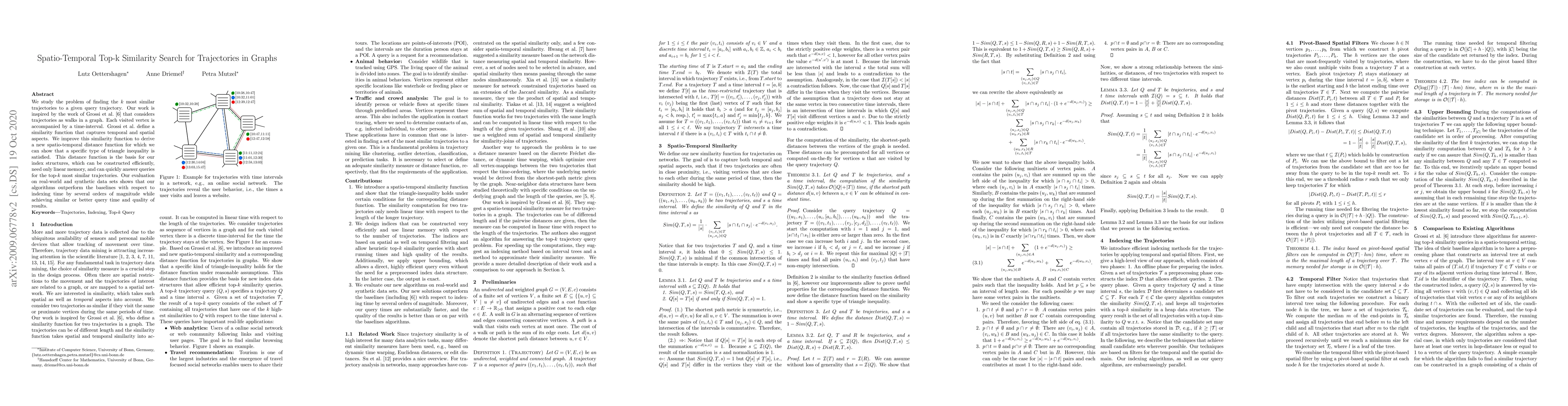 We study the problem of finding the $k$ most similar trajectories to a given query trajectory. Our work is inspired by the work of Grossi et al. [6] that considers trajectories as walks in a graph. Each visited vertex is accompanied by a time-interval. Grossi et al. define a similarity function that captures temporal and spatial aspects. We improve this similarity function to derive a new spatio-temporal distance function for which we can show that a specific type of triangle inequality is satisfied. This distance function is the basis for our index structures, which can be constructed efficiently, need only linear memory, and can quickly answer queries for the top-$k$ most similar trajectories. Our evaluation on real-world and synthetic data sets shows that our algorithms outperform the baselines with respect to indexing time by several orders of magnitude while achieving similar or better query time and quality of results.