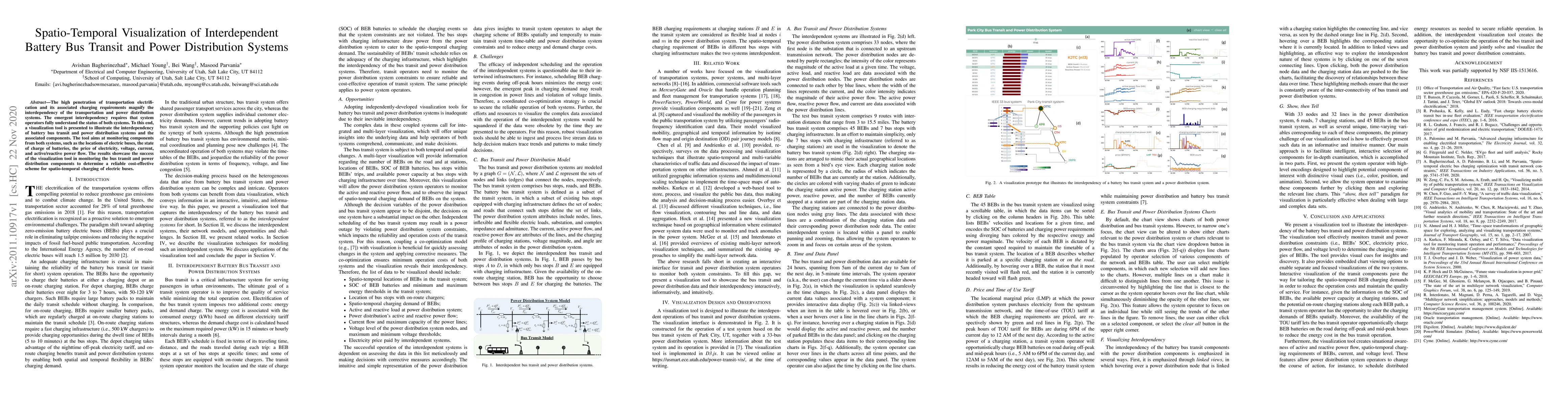 The high penetration of transportation electrification and its associated charging requirements magnify the interdependency of the transportation and power distribution systems. The emergent interdependency requires that system operators fully understand the status of both systems. To this end, a visualization tool is presented to illustrate the interdependency of battery bus transit and power distribution systems and the associated components. The tool aims at monitoring components from both systems, such as the locations of electric buses, the state of charge of batteries, the price of electricity, voltage, current, and active/reactive power flow. The results showcase the success of the visualization tool in monitoring the bus transit and power distribution components to determine a reliable cost-effective scheme for spatio-temporal charging of electric buses.