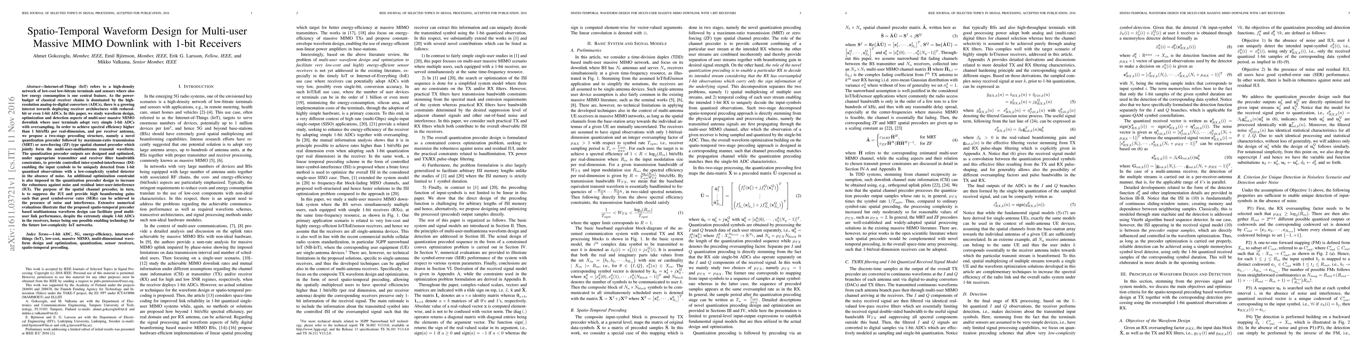Internet-of-Things (IoT) refers to a high-density network of low-cost low-bitrate terminals and sensors where also low energy consumption is one central feature. As the power-budget of classical receiver chains is dominated by the high-resolution analog-to-digital converters (ADCs), there is a growing interest towards deploying receiver architectures with reduced-bit or even 1-bit ADCs. In this paper, we study waveform design, optimization and detection aspects of multi-user massive MIMO downlink where user terminals adopt very simple 1-bit ADCs with oversampling. In order to achieve spectral efficiency higher than 1 bit/s/Hz per real-dimension, we propose a two-stage precoding, namely a novel quantization precoder followed by maximum-ratio transmission (MRT) or zero-forcing (ZF) type spatial channel precoder which jointly form the multi-user-multiantenna transmit waveform. The quantization precoder outputs are optimized, under appropriate transmitter and receiver filter bandwidth constraints, to provide controlled inter-symbol-interference (ISI) enabling the input symbols to be uniquely detected from 1-bit quantized observations with a low-complexity symbol detector in the absence of noise. An additional optimization constraint is also imposed in the quantization precoder design to increase the robustness against noise and residual inter-user-interference (IUI). The purpose of the spatial channel precoder, in turn, is to suppress the IUI and provide high beamforming gains such that good symbol-error rates (SERs) can be achieved in the presence of noise and interference. Extensive numerical evaluations illustrate that the proposed spatio-temporal precoder based multiantenna waveform design can facilitate good multi-user link performance, despite the extremely simple 1-bit ADCs in the receivers, hence being one possible enabling technology for the future low-complexity IoT networks.