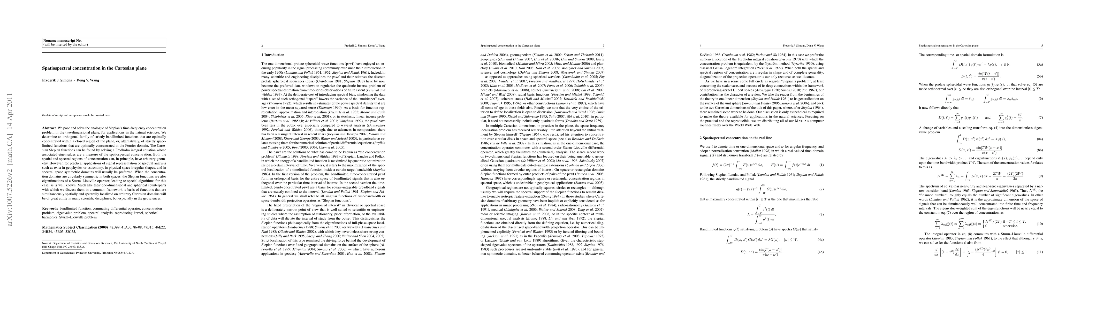 This paper extends Slepian's time-frequency concentration problem to two dimensions, determining optimal bandlimited or spacelimited functions for concentration in specified regions. These Cartesian Slepian functions are found via a Fredholm integral equation, with applications in geophysics and astronomy.