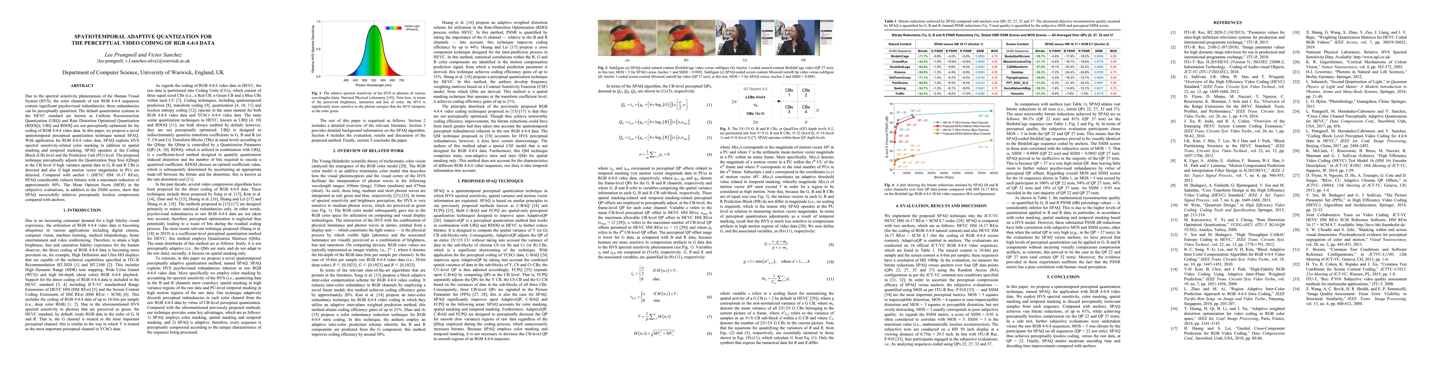 This paper proposes SPAQ, a novel spatiotemporal adaptive quantization technique for perceptually coding RGB 4:4:4 video data, which adjusts quantization based on spatial and temporal masking to exploit human visual system sensitivities. SPAQ significantly reduces bitrates by up to 80% while maintaining perceptually lossless quality, as evidenced by subjective Mean Opinion Scores and SSIM metrics.