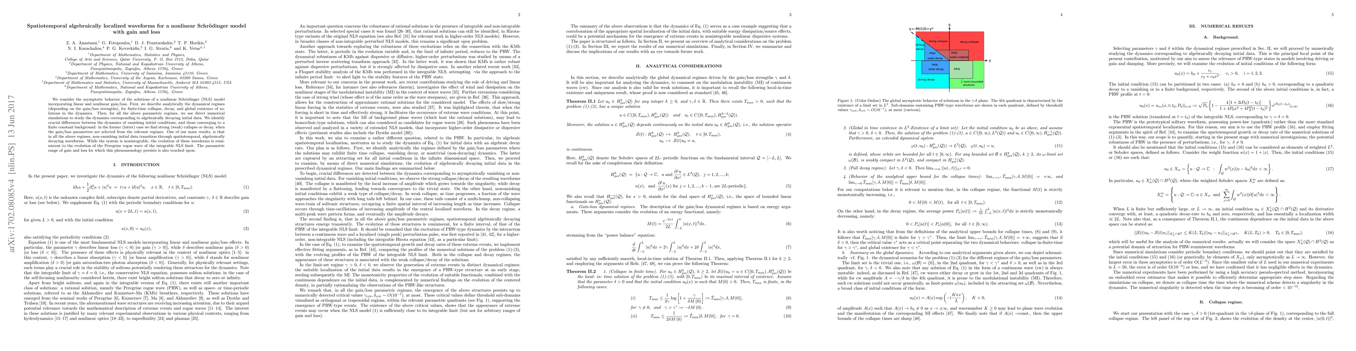 This paper analyzes the asymptotic behavior of a nonlinear Schrödinger model with gain and loss, identifying dynamical regimes for finite-time collapse, decay, and global existence. It reveals that non-vanishing initial data evolve into spatiotemporal algebraically localized waveforms, similar to the Peregrine rogue wave, under specific gain/loss parameters.
