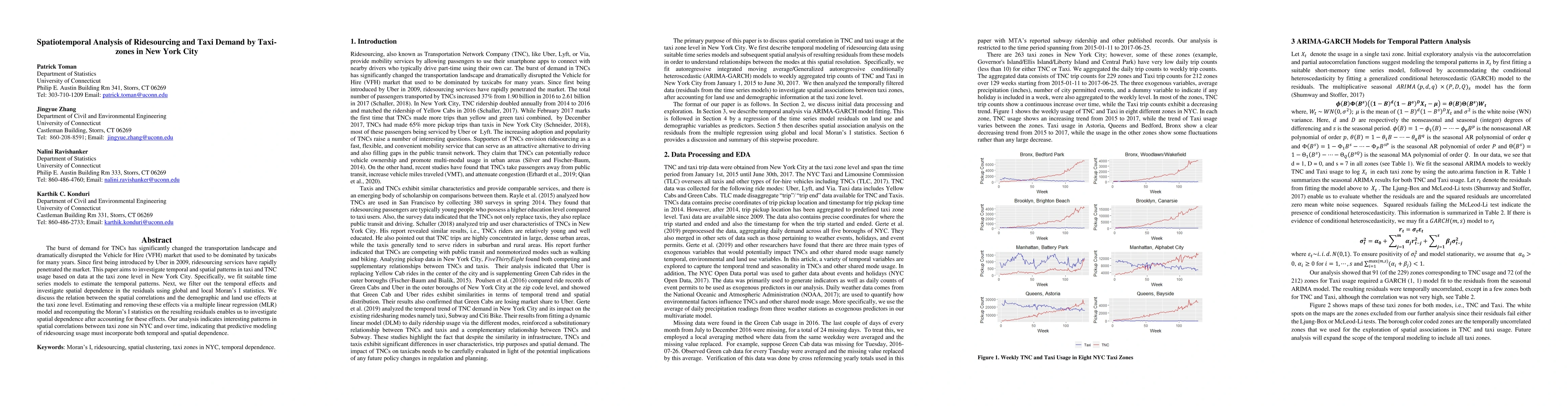 This paper examines the temporal and spatial dynamics of ridesourcing and taxi demand in New York City's taxi zones using time series models and spatial statistics. It finds significant spatial correlations between taxi zones that persist after accounting for demographic and land use factors, highlighting the need for predictive models to consider both temporal and spatial dependencies.