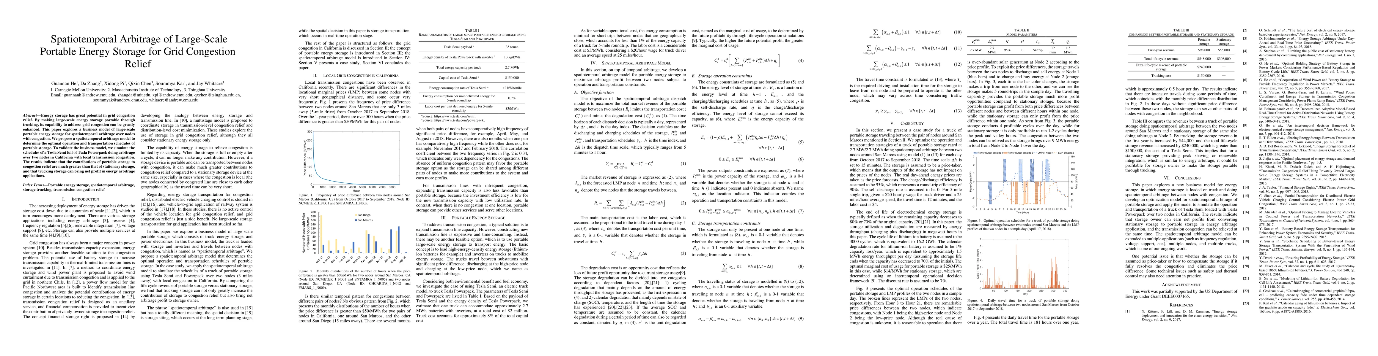 This paper proposes a business model for large-scale portable energy storage to alleviate grid congestion through spatiotemporal arbitrage. The study develops a model to optimize the operation and transportation of portable storage, demonstrating its greater effectiveness compared to stationary storage and potential profitability in energy arbitrage.