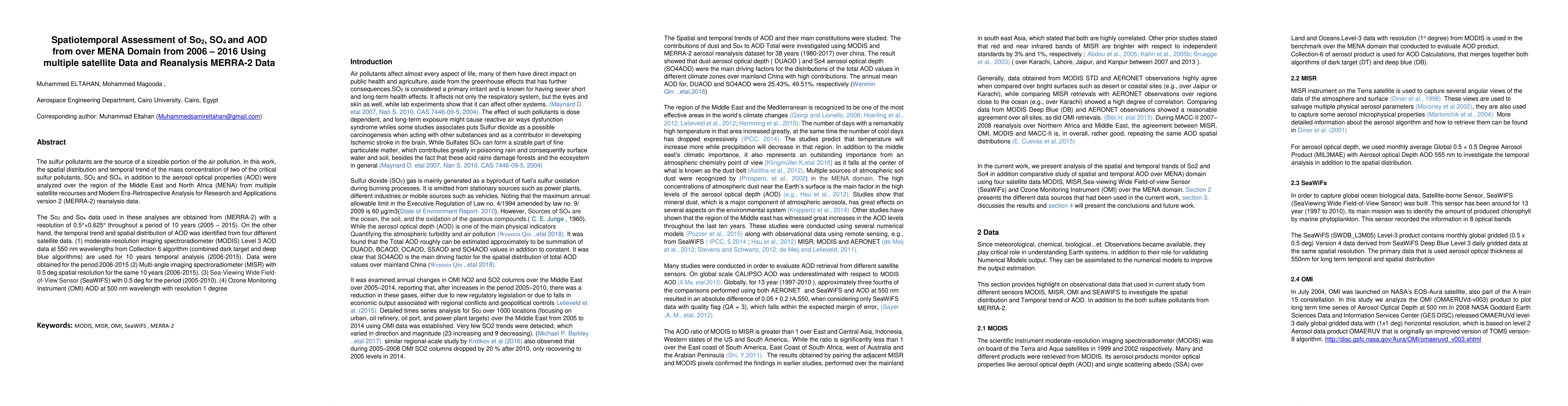 The sulfur pollutants are the source of a sizeable portion of the air pollution. In this work, the spatial distribution and temporal trend of the mass concentration of two of the critical sulfur pollutants, SO2 and SO4, in addition to the aerosol optical properties (AOD) were analyzed over the region of the Middle East and North Africa (MENA) from multiple satellite resources and Modern Era Retrospective Analysis for Research and Applications version 2 (MERRA2) reanalysis data. The So2 and So4 data used in these analyses are obtained from (MERRA2) with a resolution of 0.5 x 0.625 deg throughout a period of 10 years (2005 to 2015). On the other hand, the temporal trend and spatial distribution of AOD was identified from four different satellite data. (1) moderate resolution imaging spectroradiometer (MODIS) Level 3 AOD data at 550 nm wavelengths from Collection 6 algorithm (combined dark target and deep blue algorithms) are used for 10 years temporal analysis (2006 to 2015). Data were obtained for the period 2006 to 2015 (2) Multi angle imaging spectroradiometer (MISR) with 0.5 deg spatial resolution for the same 10 years (2006 to 2015). (3) Sea Viewing Wide Field of View Sensor (SeaWIFS) with 0.5 deg for the period (2005 to 2010). (4) Ozone Monitoring Instrument (OMI) AOD at 500 nm wavelength with resolution 1 degree.