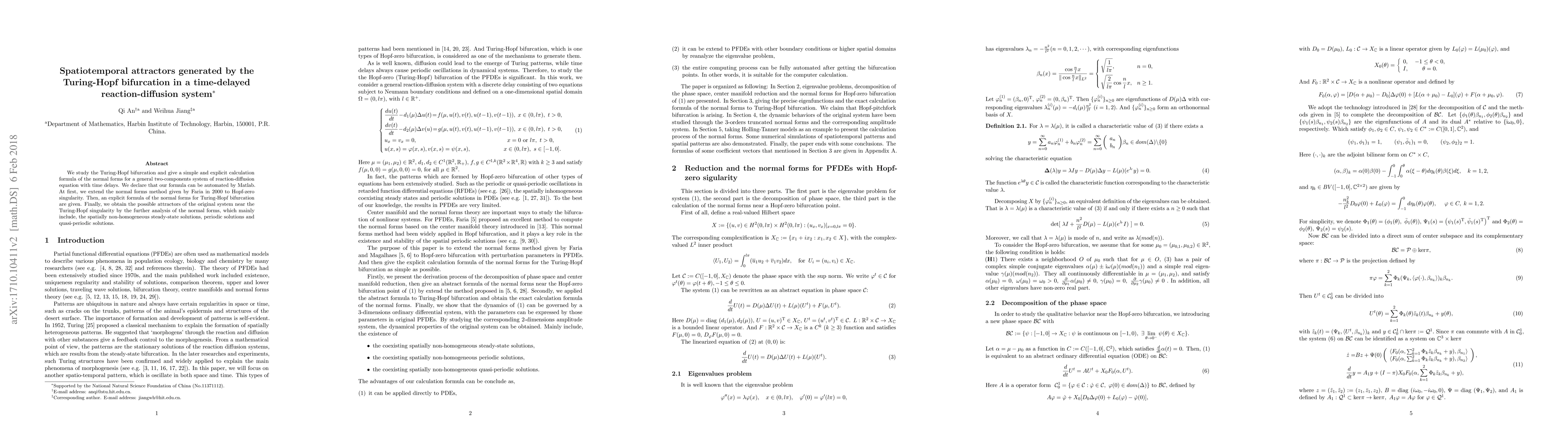 This paper explores the Turing-Hopf bifurcation in time-delayed reaction-diffusion systems, providing an explicit calculation formula for normal forms and demonstrating the possibility of Matlab automation. The study extends Faria's 2000 method to Hopf-zero singularity and identifies spatiotemporal attractors, including steady-state, periodic, and quasi-periodic solutions.