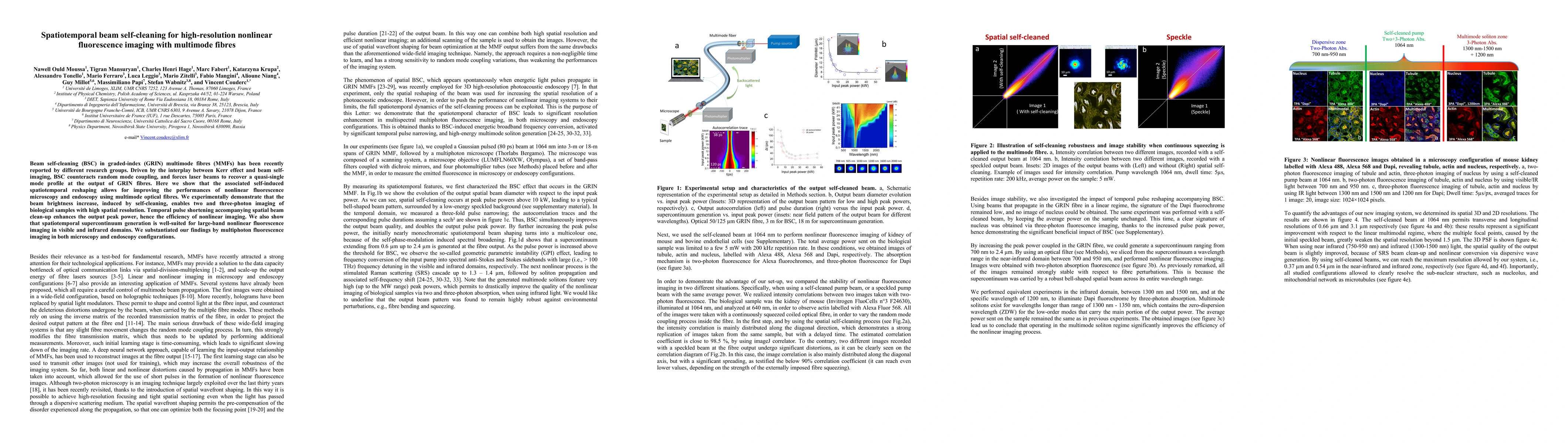 This paper demonstrates that beam self-cleaning in graded-index multimode fibres enhances the performance of nonlinear fluorescence imaging, enabling high-resolution two and three-photon microscopy and endoscopy. The spatiotemporal reshaping and increased beam brightness improve imaging efficiency and facilitate large-band nonlinear fluorescence imaging across visible and infrared domains.