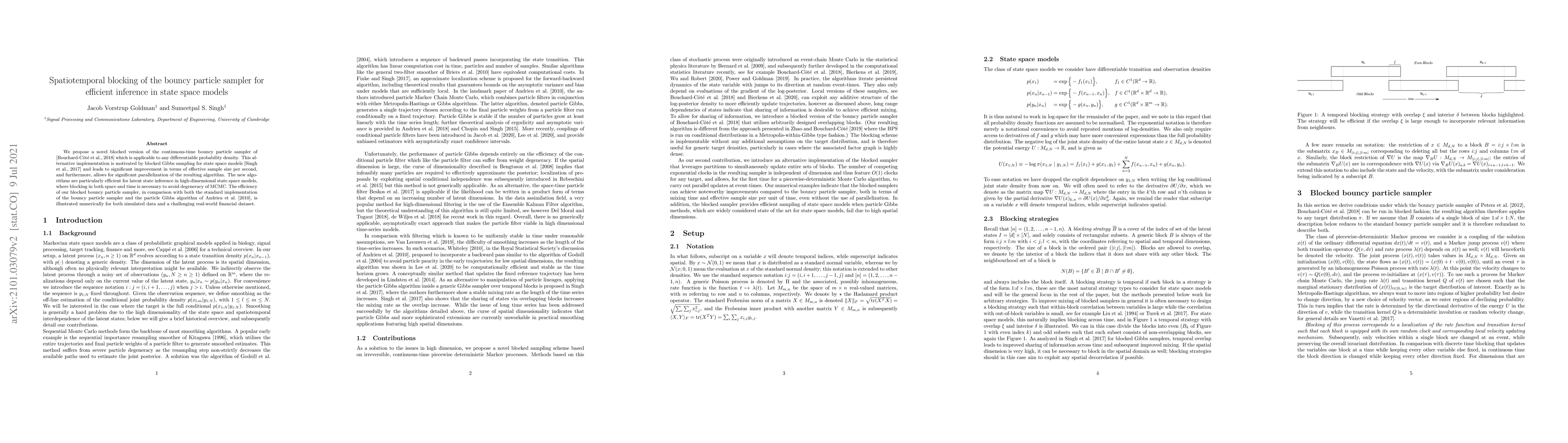 This paper introduces a spatiotemporal blocking method for the bouncy particle sampler, significantly improving inference efficiency in high-dimensional state space models. The proposed blocked version allows for parallelization and outperforms both the standard bouncy particle sampler and the particle Gibbs algorithm in real-world applications.