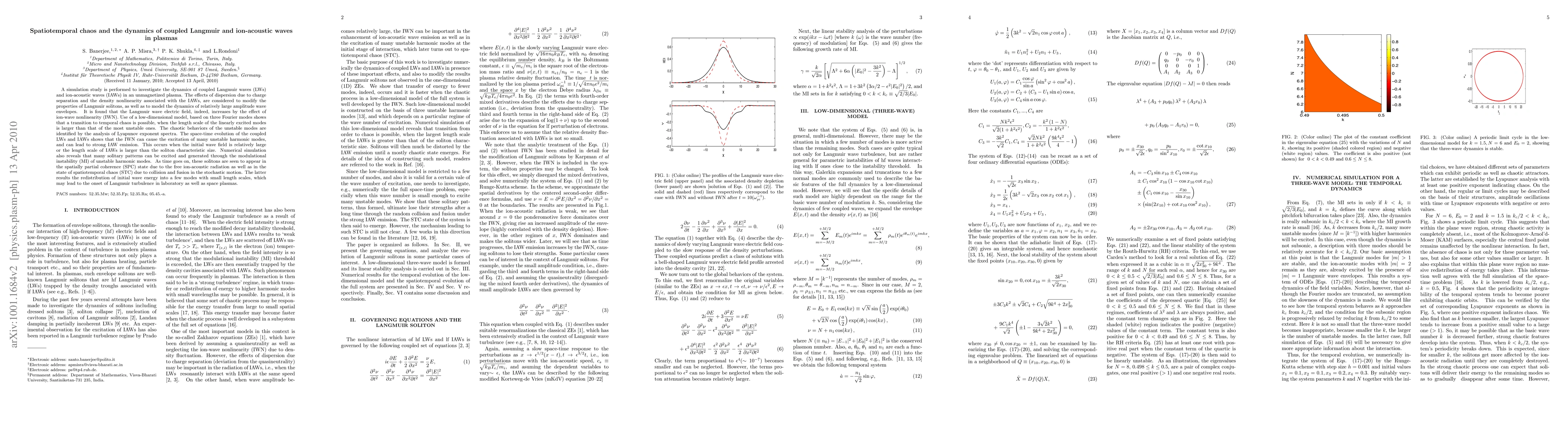 A simulation study is performed to investigate the dynamics of coupled Langmuir waves (LWs) and ion-acoustic waves (IAWs) in an unmagnetized plasma. The effects of dispersion due to charge separation and the density nonlinearity associated with the IAWs, are considered to modify the properties of Langmuir solitons, as well as to model the dynamics of relatively large amplitude wave envelopes. It is found that the Langmuir wave electric field, indeed, increases by the effect of ion-wave nonlinearity (IWN). Use of a low-dimensional model, based on three Fourier modes shows that a transition to temporal chaos is possible, when the length scale of the linearly excited modes is larger than that of the most unstable ones. The chaotic behaviors of the unstable modes are identified by the analysis of Lyapunov exponent spectra. The space-time evolution of the coupled LWs and IAWs shows that the IWN can cause the excitation of many unstable harmonic modes, and can lead to strong IAW emission. This occurs when the initial wave field is relatively large or the length scale of IAWs is larger than the soliton characteristic size. Numerical simulation also reveals that many solitary patterns can be excited and generated through the modulational instability (MI) of unstable harmonic modes. As time goes on, these solitons are seen to appear in the spatially partial coherence (SPC) state due to the free ion-acoustic radiation as well as in the state of spatiotemporal chaos (STC) due to collision and fusion in the stochastic motion. The latter results the redistribution of initial wave energy into a few modes with small length scales, which may lead to the onset of Langmuir turbulence in laboratory as well as space plasmas.
