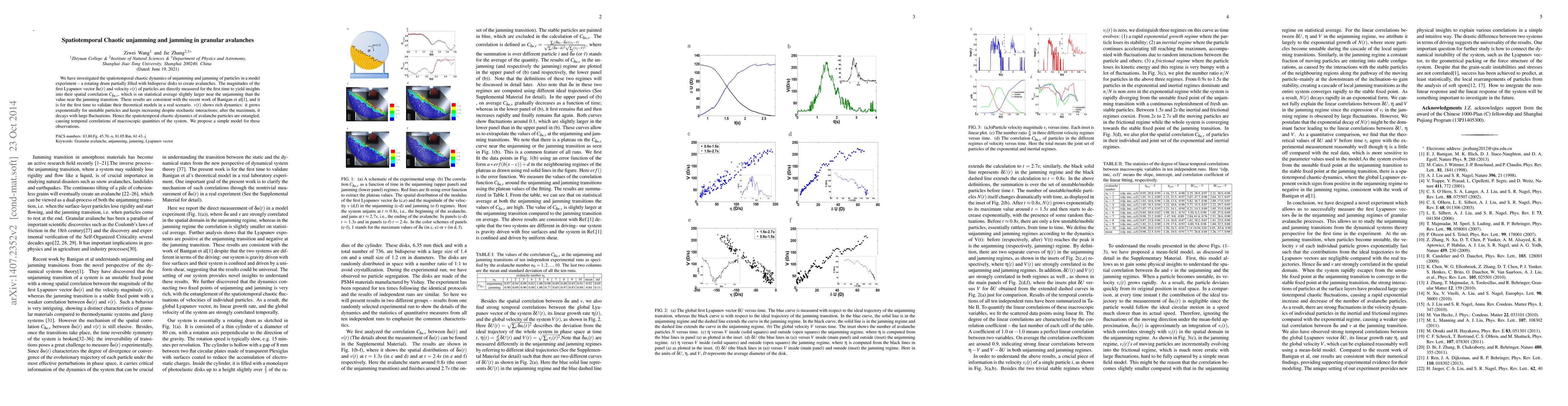 We have investigated the spatiotemporal chaotic dynamics of unjamming and jamming of particles in a toy-model system -- a rotating drum partially filled with bidisperse disks to create avalanches. The magnitudes of the first Lyapunov vector $\delta u(t)$ and velocity $v(t)$ of particles are directly measured for the first time to yield insights into their spatial correlation $C_{\delta u,v}$, which is stronger near the unjamming but is weaker near the jamming transition, consistent with the recent work of Banigan et al., Nature Phys. $\bf{9}$, 288, (2013). $v(t)$ shows rich dynamics: it grows exponentially for unstable particles and keeps increasing despite stochastic interactions; after the maximum, it decays with large fluctuations. Hence the spatiotemporal chaotic dynamics of avalanche particles are entangled, causing temporal correlations of macroscopic quantities of the system. We propose a simple model for these observations.