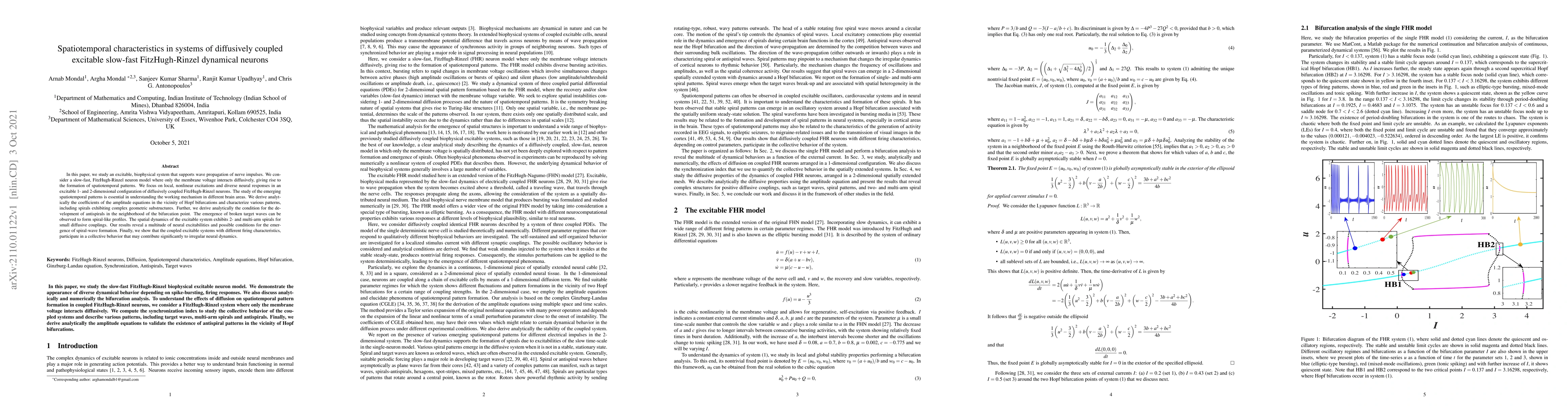 In this paper, we study an excitable, biophysical system that supports wave propagation of nerve impulses. We consider a slow-fast, FitzHugh-Rinzel neuron model where only the membrane voltage interacts diffusively, giving rise to the formation of spatiotemporal patterns. We focus on local, nonlinear excitations and diverse neural responses in an excitable 1- and 2-dimensional configuration of diffusively coupled FitzHugh-Rinzel neurons. The study of the emerging spatiotemporal patterns is essential in understanding the working mechanism in different brain areas. We derive analytically the coefficients of the amplitude equations in the vicinity of Hopf bifurcations and characterize various patterns, including spirals exhibiting complex geometric substructures. Further, we derive analytically the condition for the development of antispirals in the neighborhood of the bifurcation point. The emergence of broken target waves can be observed to form spiral-like profiles. The spatial dynamics of the excitable system exhibits 2- and multi-arm spirals for small diffusive couplings. Our results reveal a multitude of neural excitabilities and possible conditions for the emergence of spiral-wave formation. Finally, we show that the coupled excitable systems with different firing characteristics, participate in a collective behavior that may contribute significantly to irregular neural dynamics.