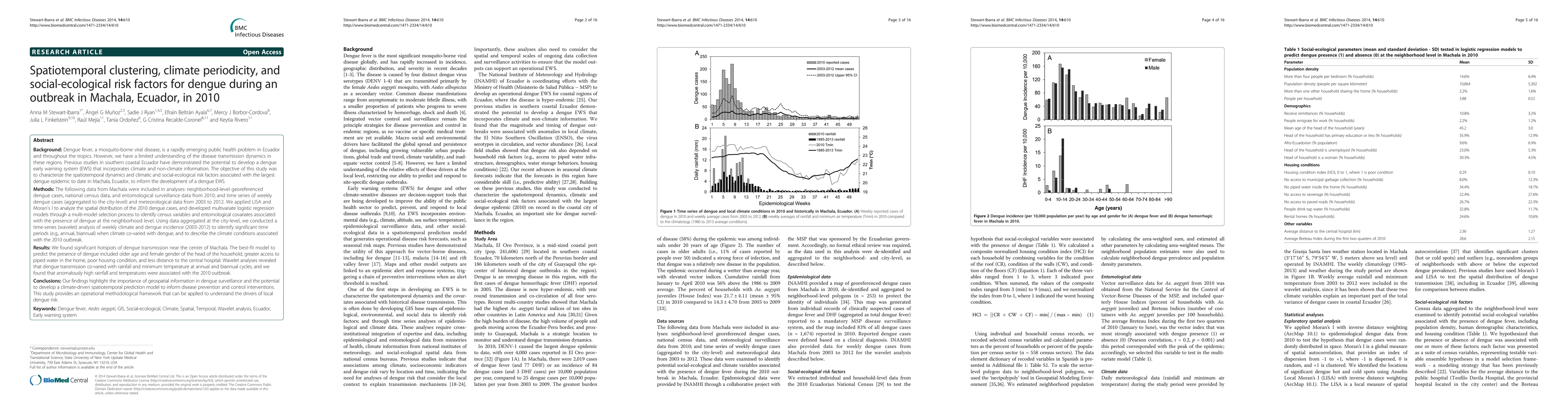 This study investigates the spatiotemporal dynamics and risk factors of the 2010 dengue outbreak in Machala, Ecuador, identifying significant hotspots and correlating climate periodicity with dengue incidence. Key predictors include socio-demographic factors and proximity to healthcare, while rainfall and temperature cycles were found to influence transmission patterns.